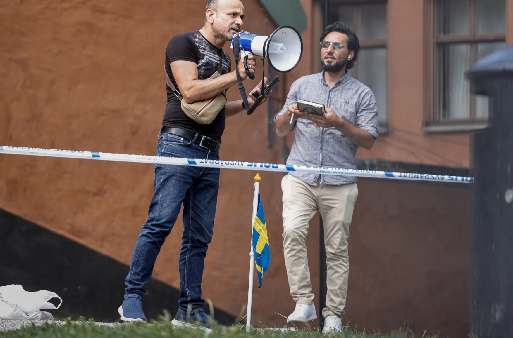 Салван Наджем (слева) и Салван Момика на акции, во время которой они сожгли Коран у мечети в Стокгольме 28 июня 2023 года. Фото: Stefan Jerrevång/TT