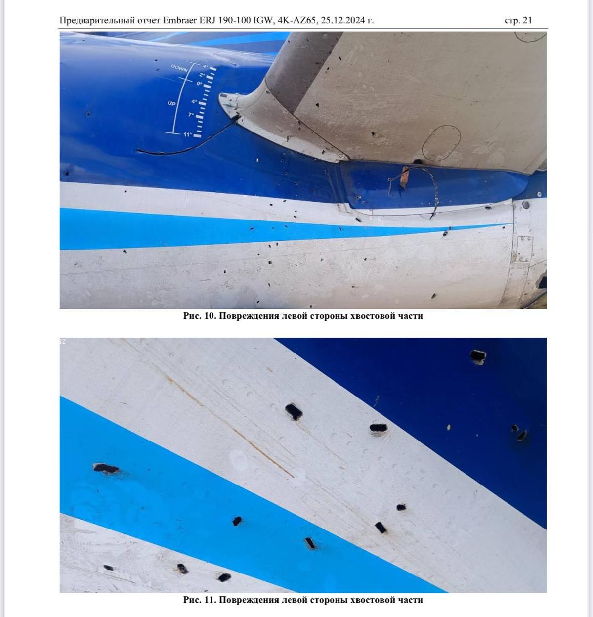 Из документа следует, что в хвостовой части фюзеляжа, киля, стабилизатора и рулей обнаружены множество «сквозных и несквозных повреждений разной величины и формы». Они также замечены на левом крыле, левом двигателе и других компонентах самолета. Некоторые отверстия имеют правильную прямоугольную форму, они напоминают поражающие элементы ракеты ПВО.