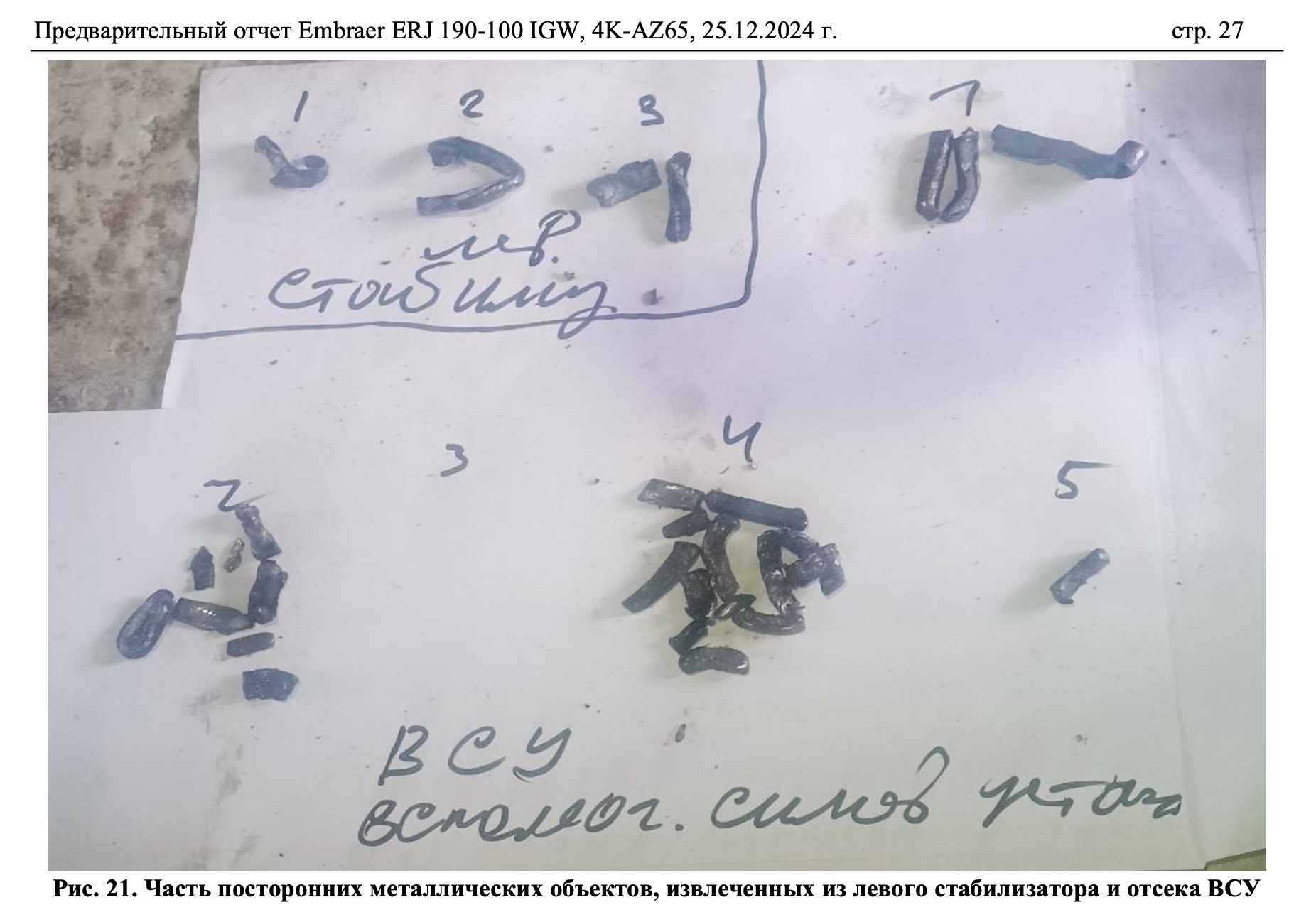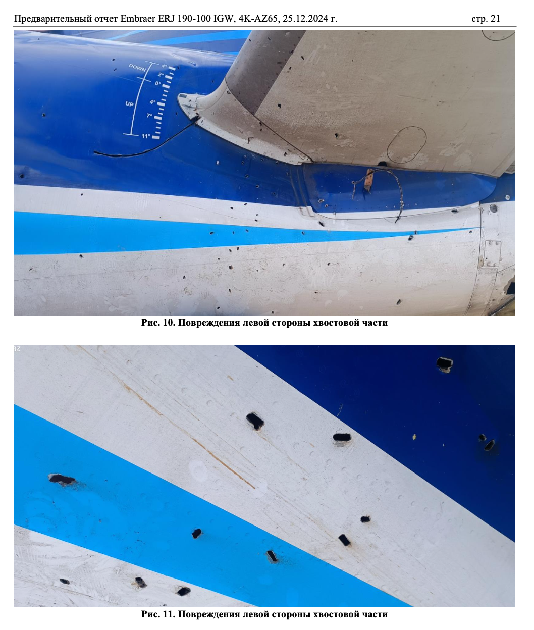 «Первоначальный осмотр сохранившихся фрагментов выявил множество сквозных и несквозных повреждений разной величины и формы в хвостовой части фюзеляжа, киля и стабилизатора, рулей высоты и направления <…> В некоторых местах повреждения имеют правильную прямоугольную форму <…> Визуальный осмотр сквозных повреждений показывает, что некоторые из них сквозные, в то время как другие являются глухими/несквозными повреждениями. Из глухих повреждений было извлечено большое количество посторонних объектов», — говорится в документе.
