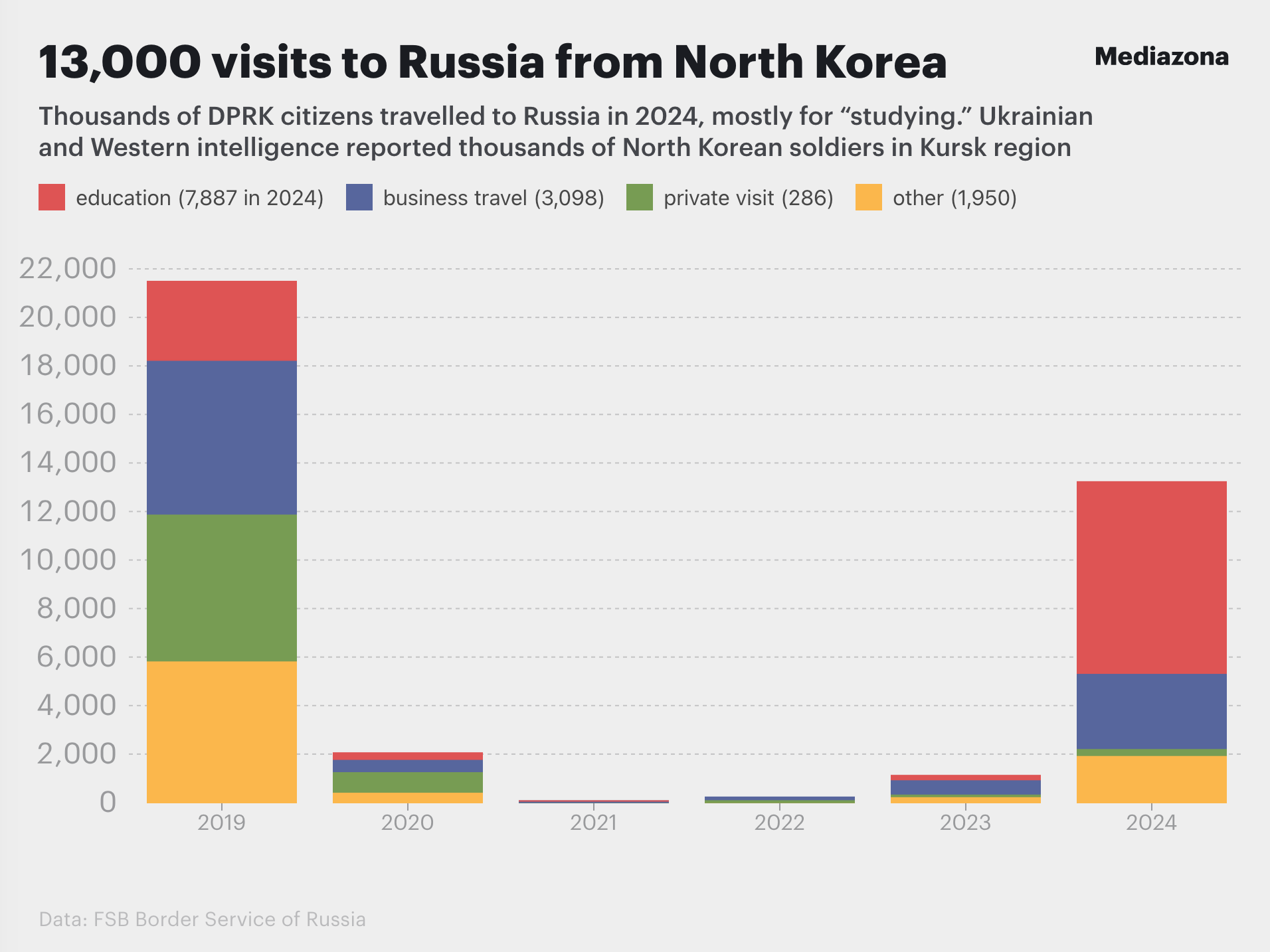 North Korean citizens crossed the Russian border over 13,000 times in 2024, with 7,887 crossings under the pretext of “studying.” This is according to fresh data from the Border Service of the Federal Security Service (FSB), Mediazona can reveal.