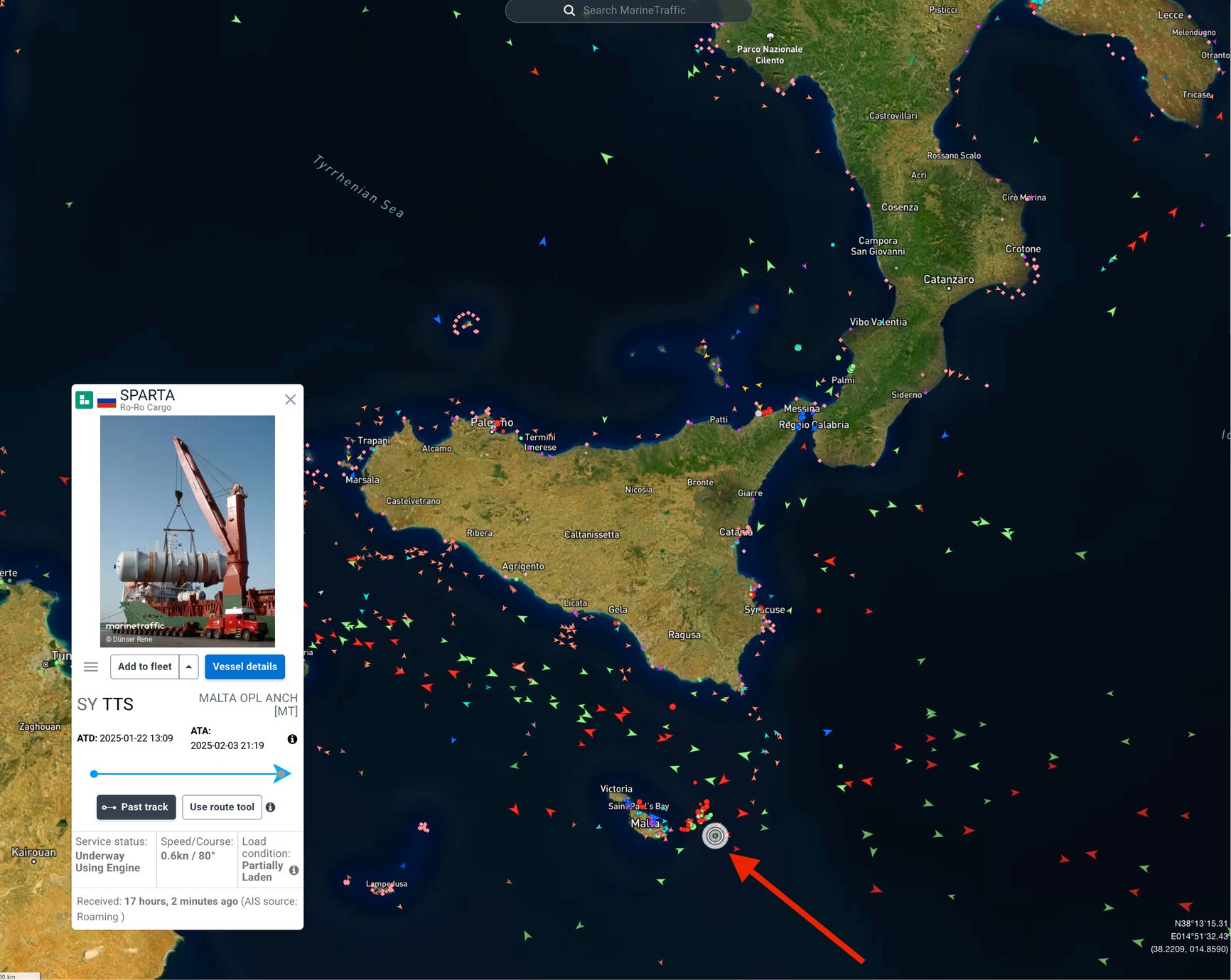 Очередное судно «Оборонлогистики», которое среди прочих вывозит из Сирии российскую технику после смены власти в стране, столкнулось с проблемами на своем пути. Ролкер Sparta, который шел из порта Тартус в Балтийск, внезапно остановился у берегов Мальты: ночью 3 февраля он ненадолго активировал передатчик AIS, зафиксировавший его местоположение, пишет «Радио Свобода». Согласно данным MarineTraffic, Мальта теперь заявлена в пункте назначения судна.
