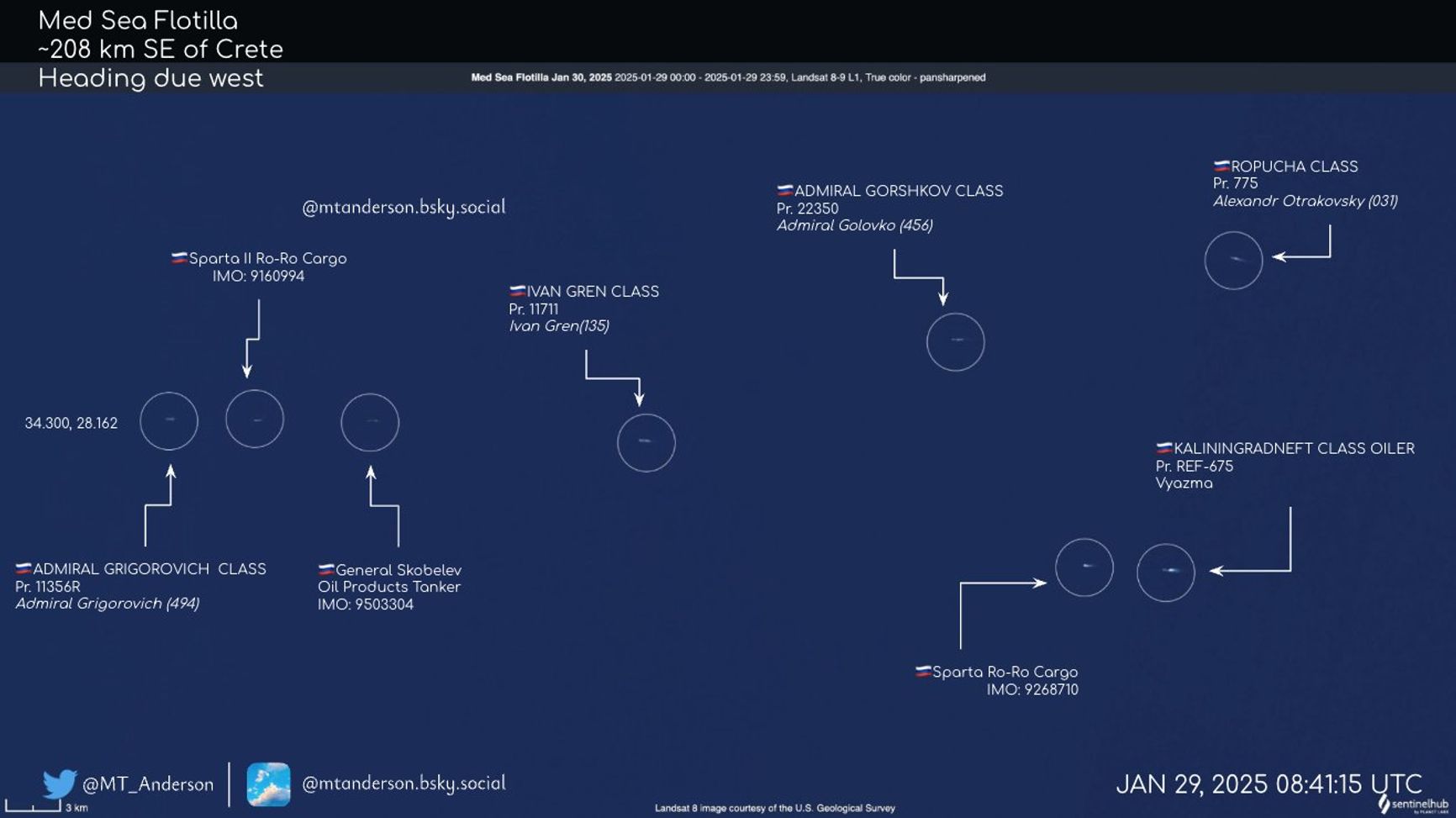 The Insider не удалось отследить актуальное местоположение Sparta и Sparta II на момент публикации материала, так как они отключили передатчики AIS (Sparta II выключил его 28 января, находясь в 30 морских милях от берега Кипра). Как сообщал OSINT-аналитик, пишущий под ником MT Anderson, который часто публикует спутниковые снимки Maxar, вся российская флотилия, задействованная в вывозе техники из Тартуса, 29 января прошла в 209 км к юго-востоку от Крита.