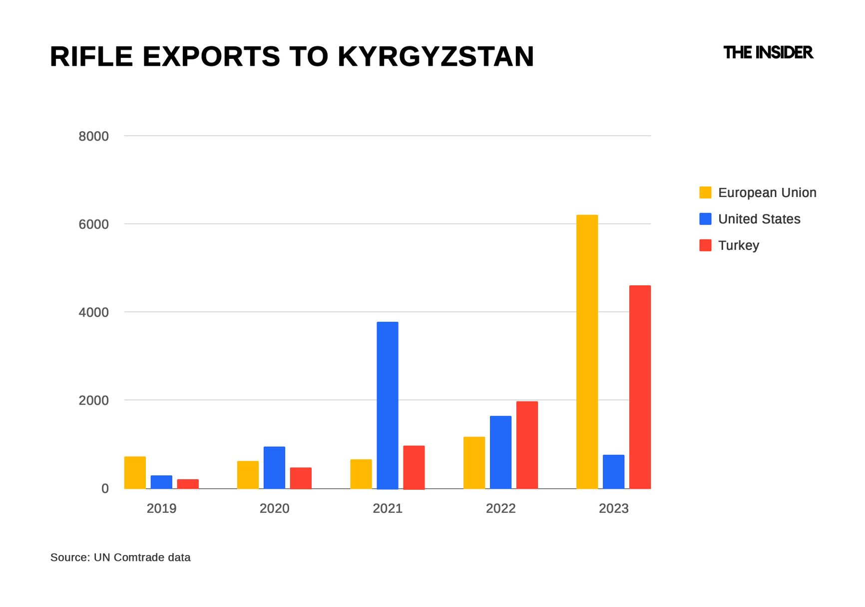 Customs data also reveals a sharp increase in weapons shipments to Kyrgyzstan from the European Union and Turkey. According to UN Comtrade statistics, imports from the Czech Republic rose from 19 total units in 2021 to 1,015 in 2023. Kyrgyz companies did not buy any firearms from Italy in 2020-2021, but in 2022 they imported 882 units, followed by 4,434 in 2023. The largest supplier, however, was Turkey — another NATO member. Turkish firearm exports to Kyrgyzstan surged from 986 units in 2021 to 4,599 in 2023.