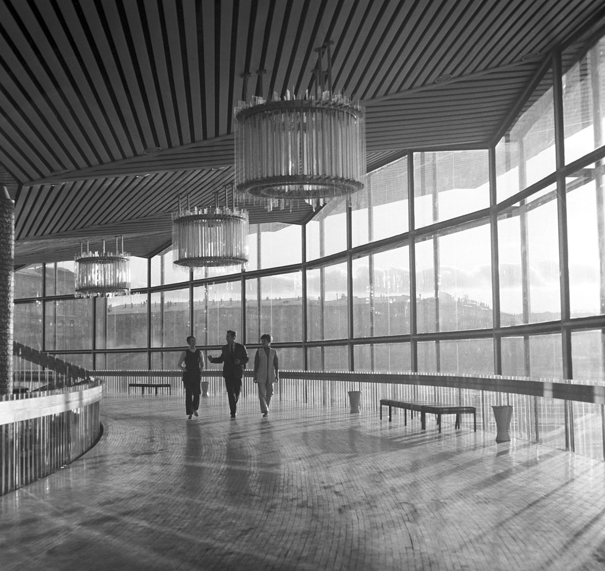 Несмотря на то, что каждая из 24 «складок» весит 30 тонн, конструкция кажется невесомой за счет стеклянных наружных стен и зеркал в облицовке фойе. Со стороны станции метро «Университет» впечатление усиливает водоем с фонтанами.