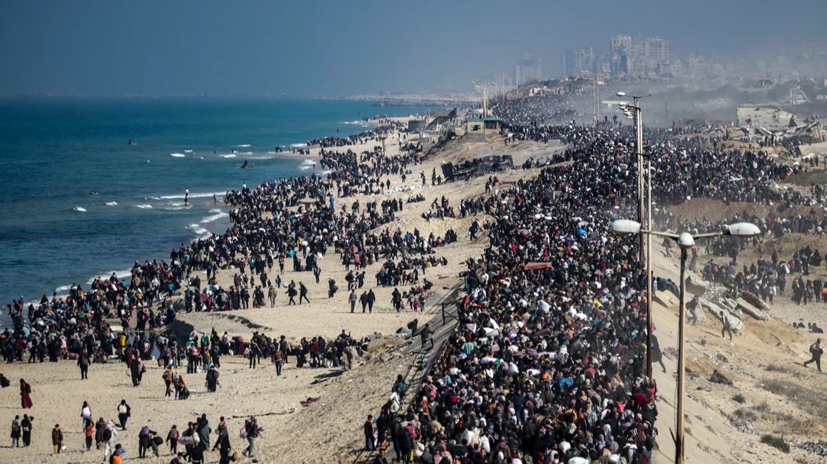Внутренне перемещённые палестинцы направляются из южной части Газы в северную по дороге Аль-Рашид, 27 января 2025 года. Фото: Mohammed Saber / EPA
