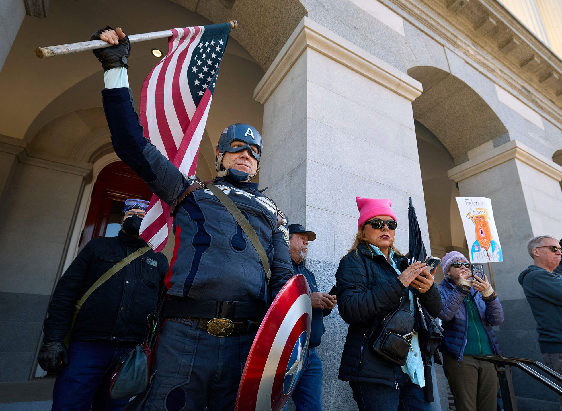 Fred Greaves / AFP / Scanpix / LETA Демонстрант в костюме Капитана Америки на ступенях капитолия в Сакраменто — столице штата Калифорния. 5 февраля 2025 года