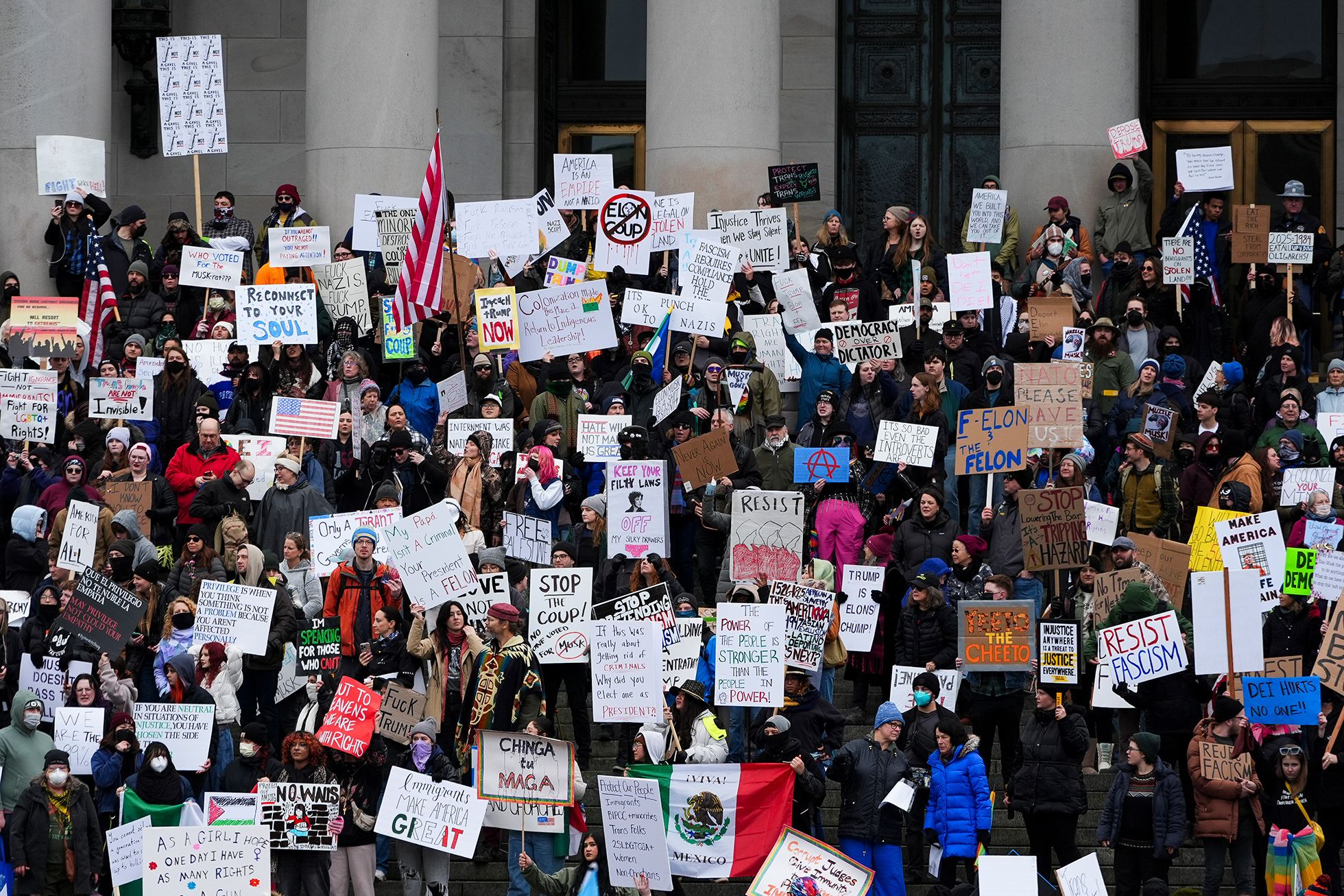 Lindsey Wasson / AP / Scanpix / LETA Демонстранты в столице штата Вашингтон — Олимпии. Среди надписей на плакатах: «Сопротивляйтесь фашизму», «Америка для всех», «Остановите переворот — никто не голосовал за Маска» и «НАТО, спаси нас». 5 февраля 2025 года