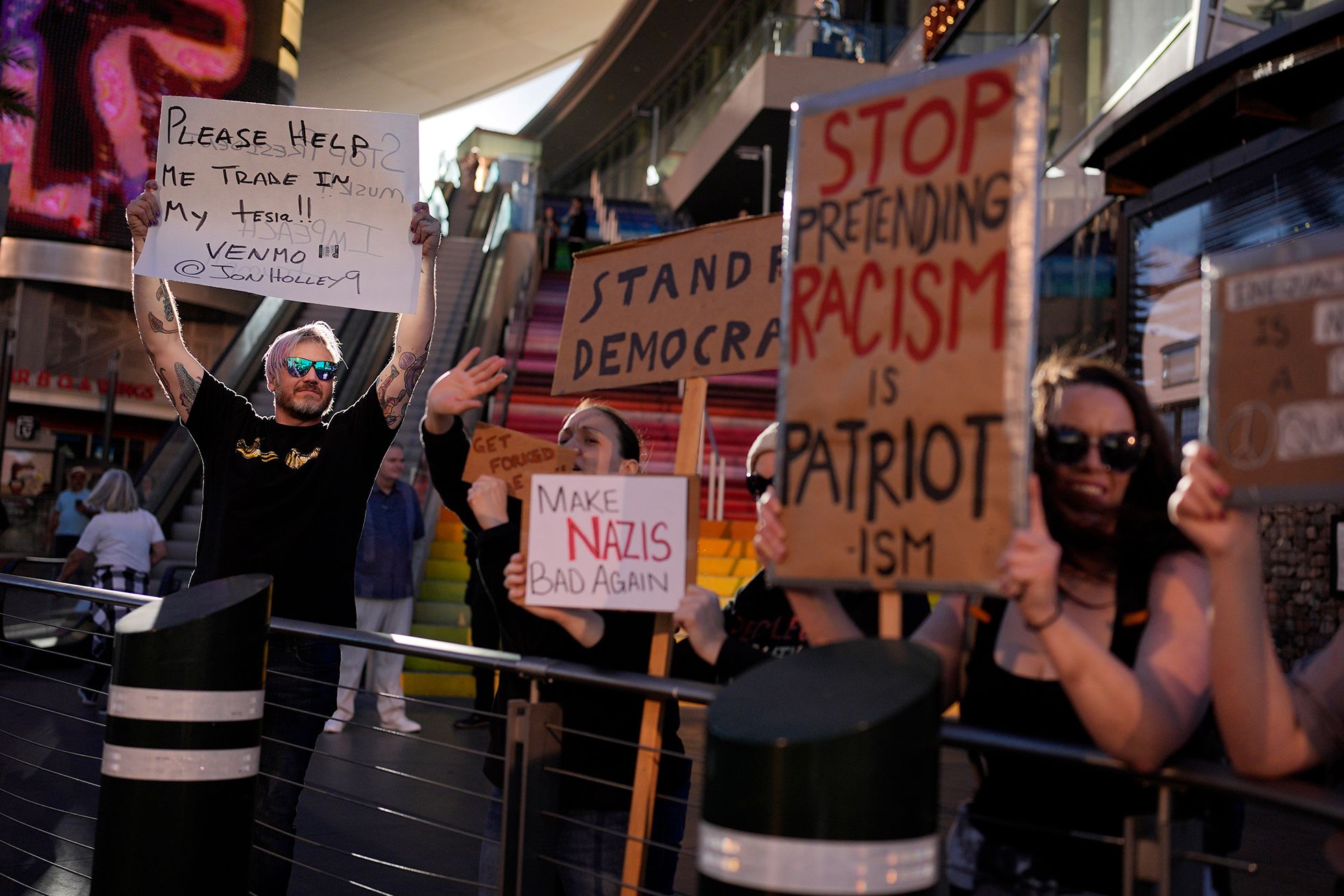 John Locher / AP / Scanpix / LETA «Прекратите делать вид, что расизм — это патриотизм» и «Пожалуйста, помогите мне сдать мою теслу по trade-in» — надписи на плакатах демонстрантов в Лас-Вегасе, штат Невада. 5 февраля 2025 года