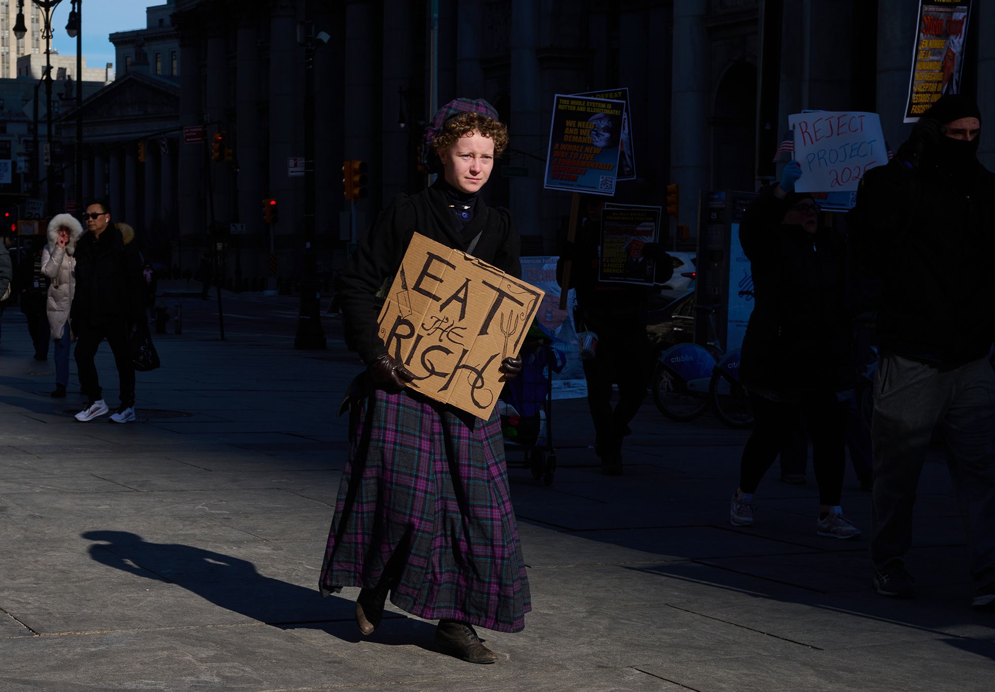 Edna Leshowitz / ZUMA Press Wire / Scanpix / LETA Участница акции в Нью-Йорке с плакатом «Eat The Rich» — лозунгом, популярным среди сторонников анархистских, левых и антикапиталистических движений. Один из его переводов на русский — «Жри буржуев». 5 февраля 2024 года