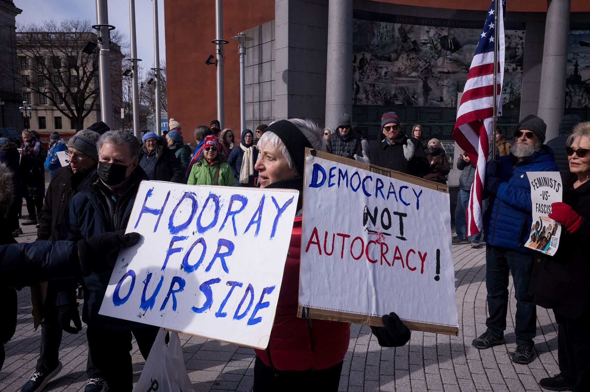Brian Branch Price / ZUMA Press Wire / Scanpix / LETA Акция протеста в Трентоне — столице штата Нью-Джерси. «Демократия — не автократия», написано на плакате справа. 5 февраля 2025 года