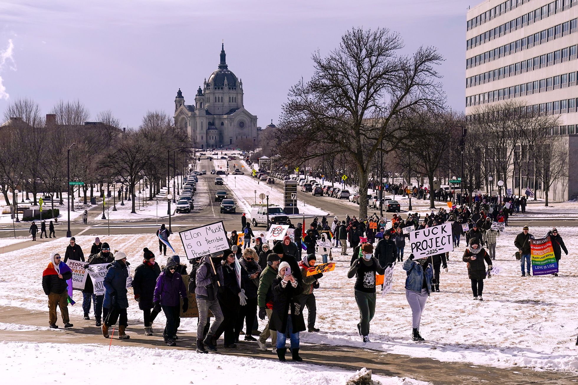 Nick Wosika / Icon SMI / ZUMA Press / Scanpix / LETA Протестующие у капитолия штата Миннесота. В руках у одного из демонстрантов плакат «Илон Маск — ужасный президент». Сент-Пол, 5 февраля 2025 года