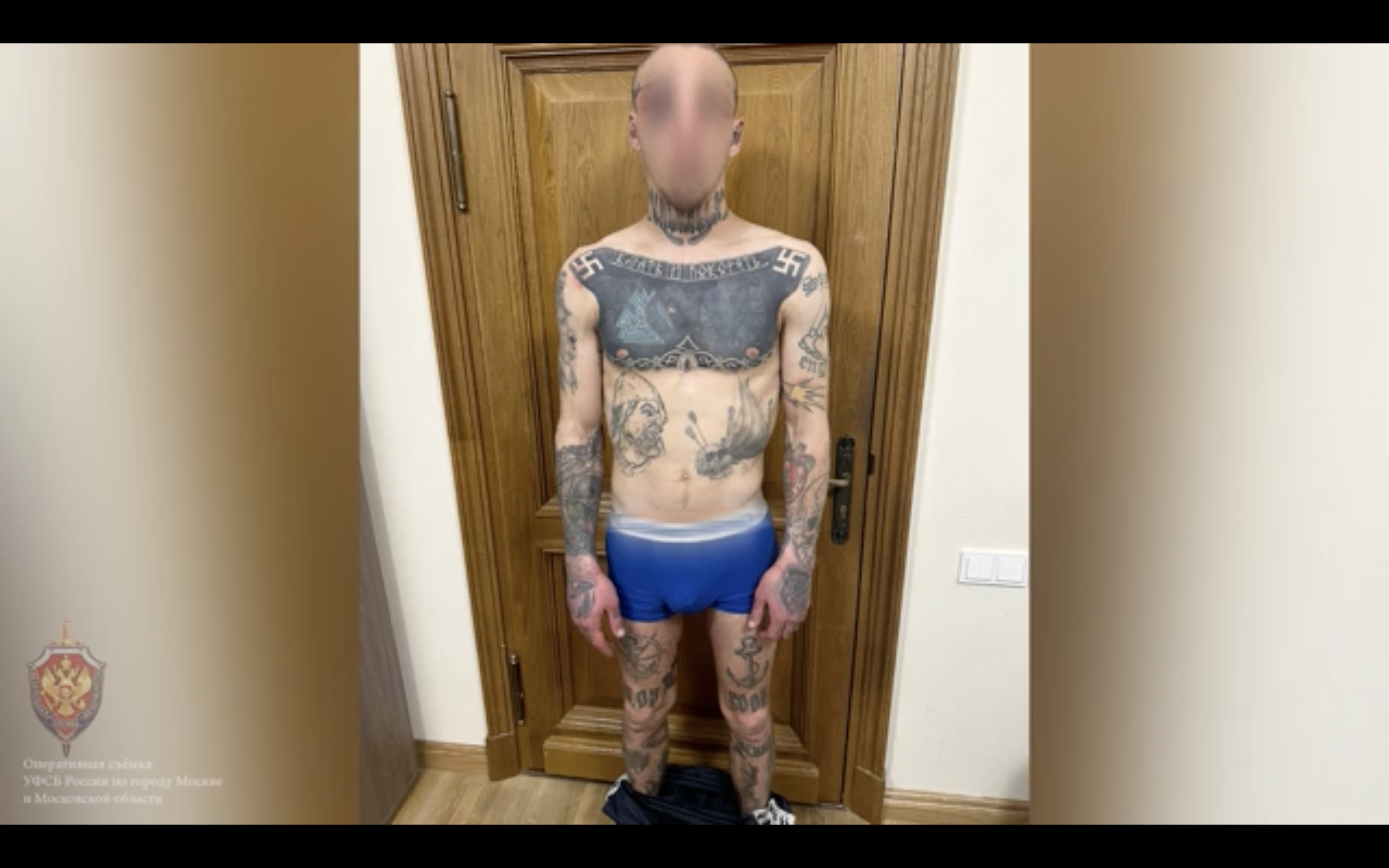 ФСБ показала видео, на котором силовики заходят в квартиру к молодому человеку и кладут его напол. На следующих кадрах показаны лежащие на полу нашивки с флагом и гербом Украины и украинский паспорт, а затем — торс мужчины с татуировками. На груди изображены валькнут, свастики и надпись «Карать и покорять», на правой руке — портрет Адольфа Гитлера.