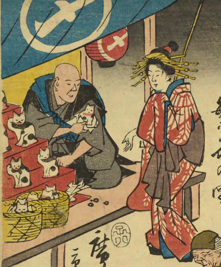 Но самое известное произведение искусства в Японии, связанное с этими животными, — изображение или статуэтка манящей кошки манэки-нэко с поднятой лапкой. Считается, что это символ удачи, благополучия и процветания. Самое раннее известное изображение манэки-нэко — гравюра художника Утагава Хиросигэ, созданная в 1852 году.