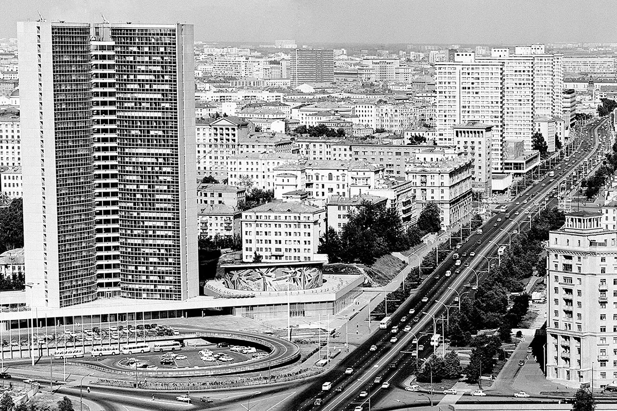 В 1963 году на 4,5 гектарах в самом центре Москвы началось строительство. Закончилось оно в 1970-м. Комплекс СЭВ завершал архитектурный ансамбль Нового Арбата (при СССР — проспекта Калинина), который строила та же команда Михаила Посохина. Ранее на этом месте не было большой магистрали, ее проложили, снеся часть старой застройки. Посохин с товарищами построили четыре знаменитых 29-этажных здания, тоже в форме раскрытых книг (по советскому телевидению часто показывали их с высвеченными на них буквами «СССР»), «магазинную полосу», которая включала в себя Дом книги, Военторг, «Москвичку» и не используемый сейчас километровый подземный тоннель. Проспект Калинина стал новым лицом советской Москвы, этаким местным Манхэттеном. Сохраненные на нём остатки старой архитектуры, как, например, храм Симеона Столпника, должны были лишь подчеркивать и оттенять прогрессивность архитектуры новой.