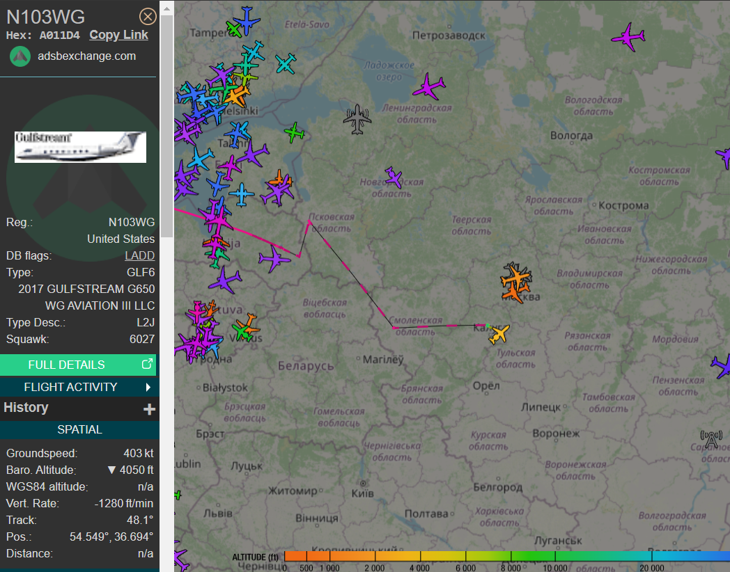 - ️По данным сервиса Adsbexchange, номер самолета — N103WG. Согласно реестру Федерального управления гражданской авиации США, эта фирма в качестве своего контактного адреса использует адрес дома в Майами-Бич, принадлежащий одной из фирм группы компаний Стива Уиткоффа THE Witkoff GROUP.