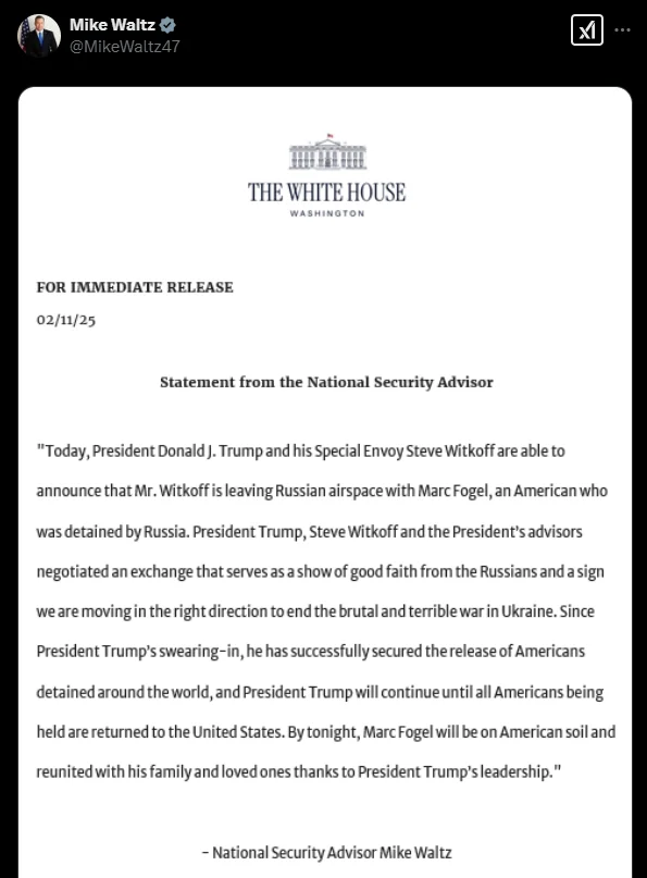 Гражданин США и экс-сотрудник американского посольства Марк Фогель освобожден из российской тюрьмы, где отбывал 14-летний срок за контрабанду марихуаны, спецборт уже доставляет Фогеля на родину, официально сообщил Белый дом и подтвердил в интервью New York Times советник Трампа по нацбезопасности Майл Уолтц.