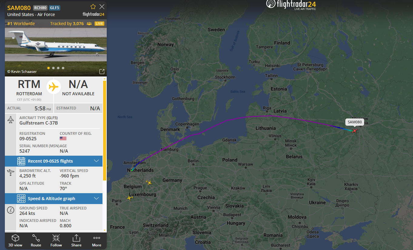 Детали. Согласно данным сервиса Flightradar24, самолет вылетел с военной авиабазы в штате Мэриленд около 12:00 по московскому времени, а затем, после часовой посадки в Роттердаме, направился в Москву. К 22:30 он пролетел Смоленскую область.