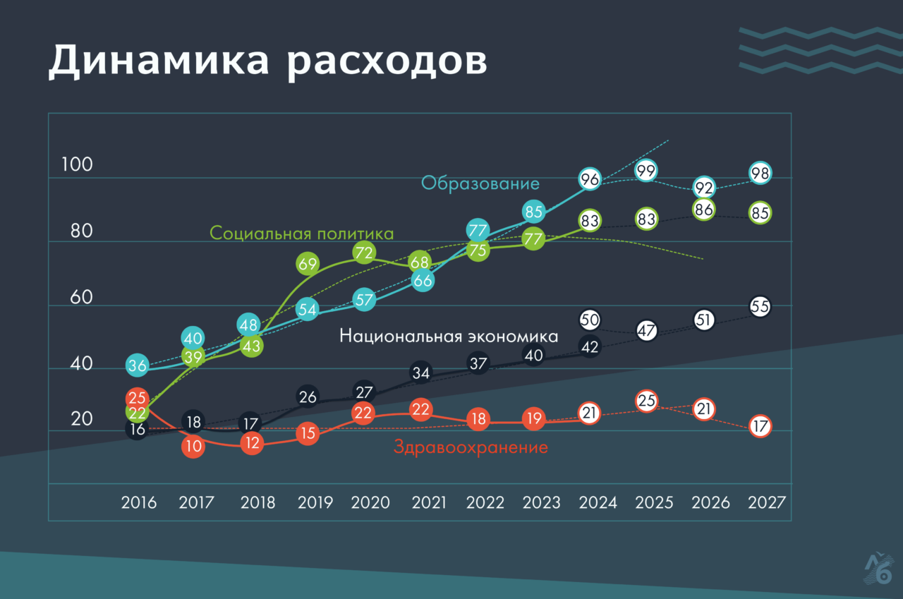 Больше всего регион тратит на образование и расходы эти растут быстрее всего. В 2023 году выросли с 75 до 85 млрд, в 2024 — до 96 млрд рублей, а в 2025 году планируют увеличить ещё на три млрд.