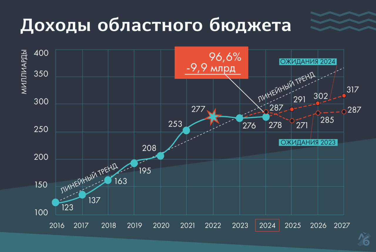 Доходы областного бюджета в 2024 году составили 278 млрд рублей. Это на два млрд выше прошлого года и на 9,9 млрд ниже, чем планировалось. В нынешнем 2025 году даже по прогнозам регионального минфина доходы ещё сократятся и составят 271 млрд рублей. Видимо, минфин знает что-то плохое.