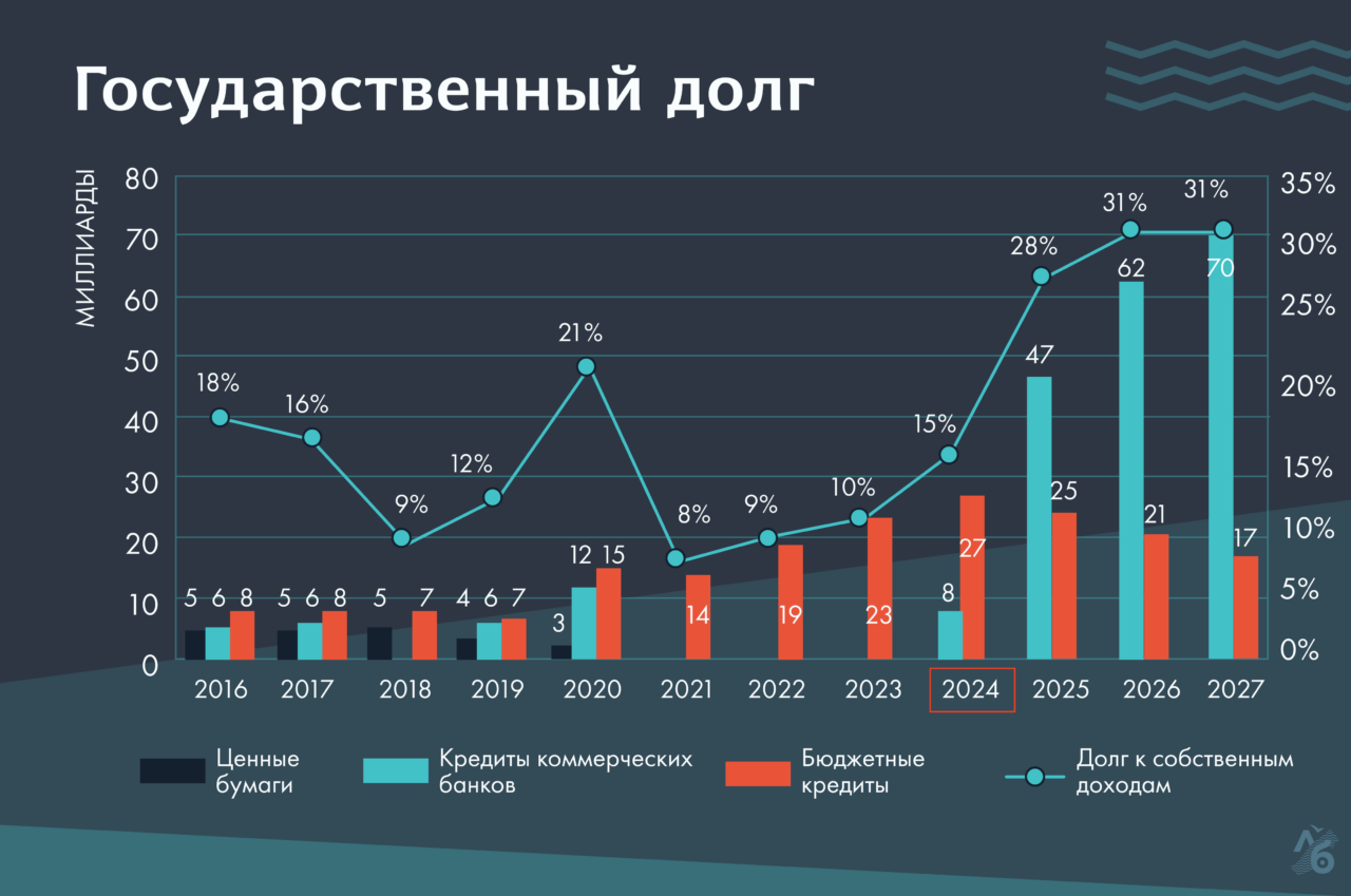 Но в 2024 году что-то случилось. Хотя, случилось оно раньше, а в прошлом году дало свои результаты — бюджетные кредиты выросли до 27 млрд, к ним добавились коммерческие кредиты — ещё 8 млрд.
