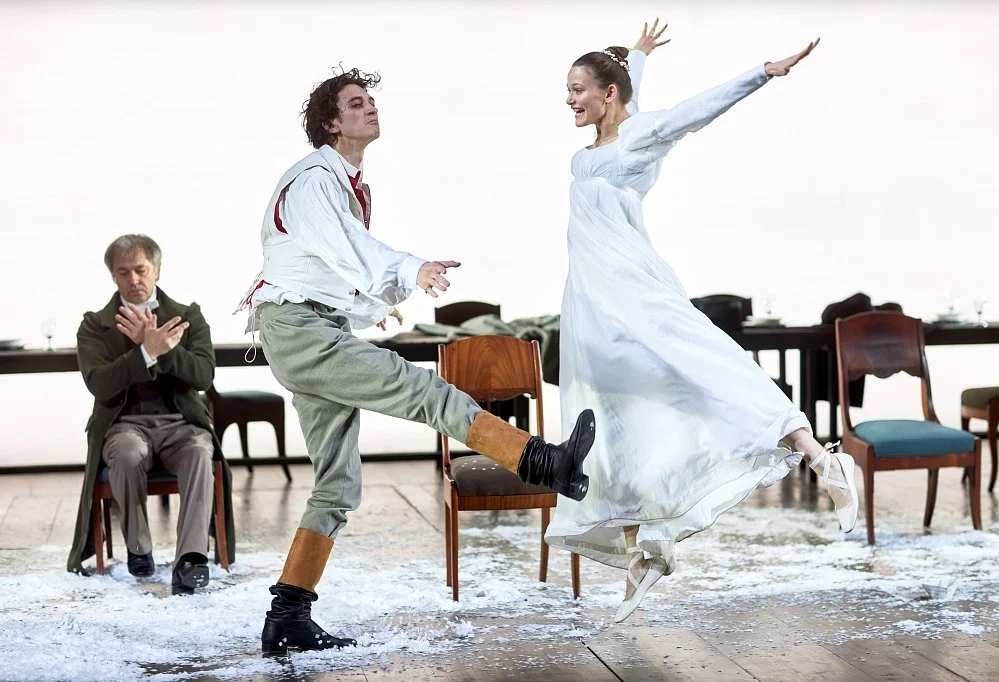Актриса Варвара Бочкова, играющая Татьяну, очень молода — театральный институт окончила только в прошлом году. Надо сказать, что все исполнители главных ролей максимально приближены к возрасту своих героев, и это своего рода вызов: раньше, чтобы играть в театре роли такого масштаба, нужно было заслужить признание и обладать авторитетом в труппе. Однако новый подход стоит назвать удачным: молодые актеры очень точно проживают потрясения, с которыми сталкиваются их герои-ровесники. В первом акте Татьяна в исполнении Бочковой порой даже вызывает отторжение. Она ведет себя очень по-детски: кричит, катается по полу, странно танцует (но очень талантливо, Варвара — бывшая студентка Академии Русского балета Вагановой) — в общем, делает все то, что ортодоксальная Татьяна никогда бы делать не стала. Но во втором акте становится ясно, что нестандартное поведение главной героини неслучайно: это сделано, чтобы во втором акте мы более явственно оценили ее внутренние перемены. Перед нами предстает уже взрослая женщина, в которой не осталось ни капли взбалмошной девочки, без памяти влюбившейся в Онегина.