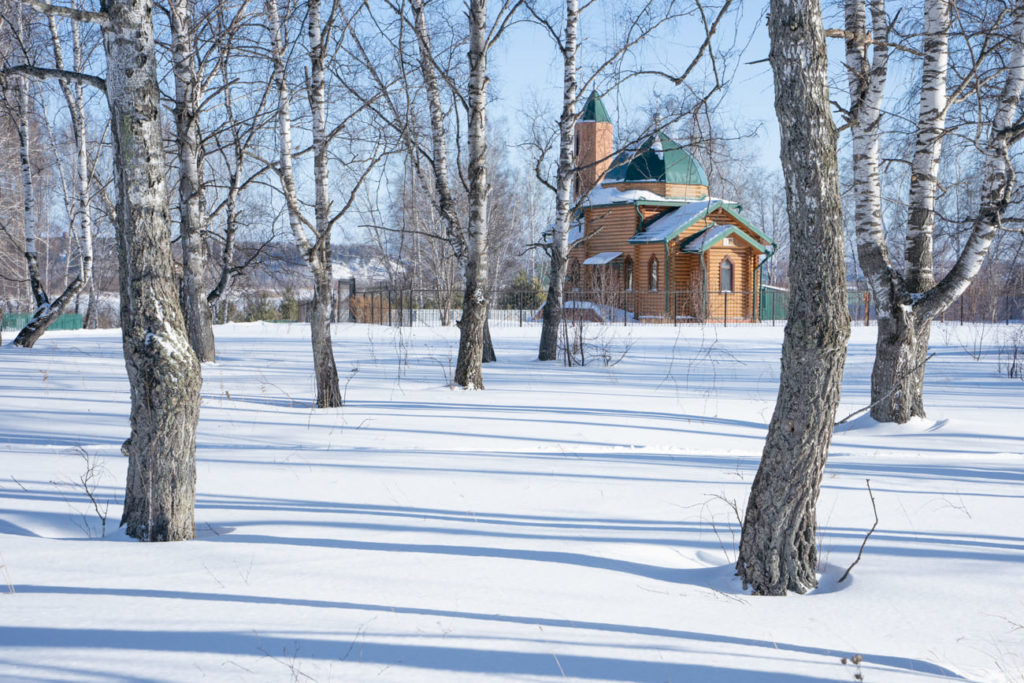 В селе есть мечеть и маленькая деревянная церковь. Мечеть за берёзовой рощей — новая, аккуратная, ухоженная. Храм святого Архангела Михаила — занесён снегом и кажется заброшенным, дверь закрыта на замок, вокруг сугробы.