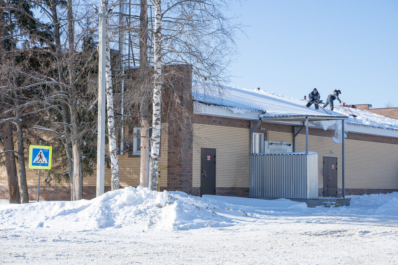 Пожилой мужчина в чёрной вязаной шапке и охотничьем костюме сгребает лопатой снег. Увидев нас с фотографом, он улыбается и тут же начинает отчитывать: