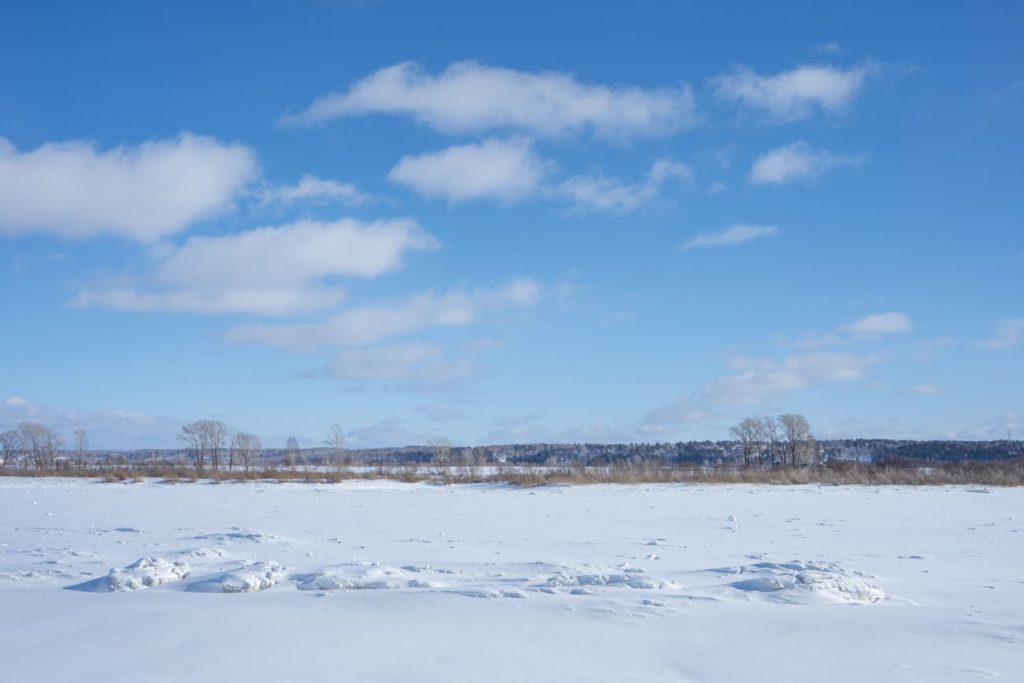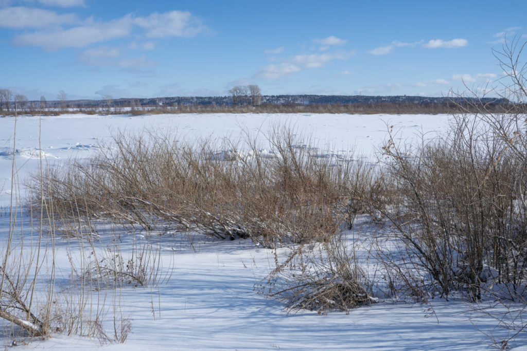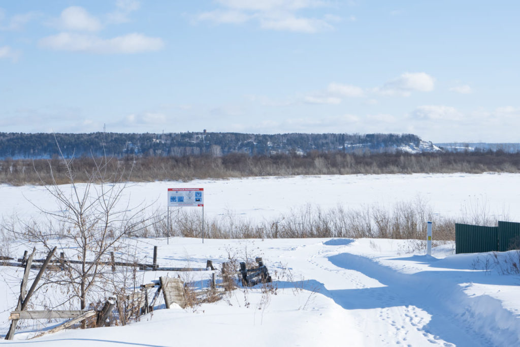 Берег Томи невысокий, застроен коттеджами. Ближе к воде — поломанные заборы вдоль огородов и заросли кустов. На реке ни рыбаков, ни лунок — всё под сугробами. Недалеко от кромки воды виднеется большая табличка «Купаться запрещено». «Наверное, после Навального поставили», — иронизирует коллега-фотограф.