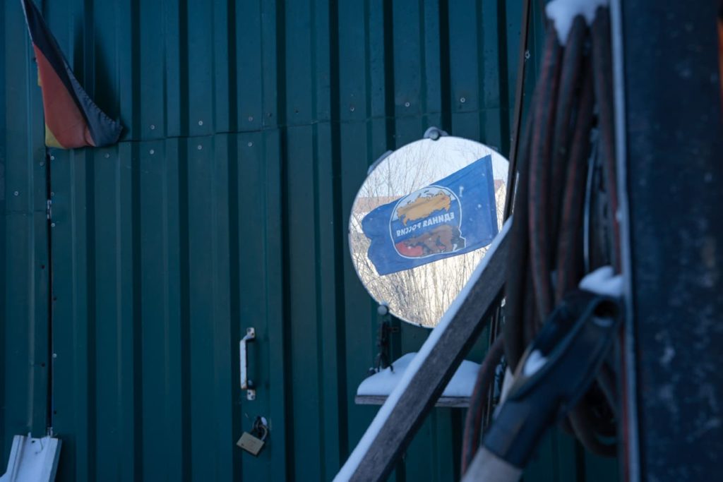 Выход к реке — в проулке. Справа — жилые коттеджи, слева — двухэтажное, как будто полузаброшенное здание, рядом с ним на деревянном столбике, вкопанном в землю, развевается флаг «Единой России».