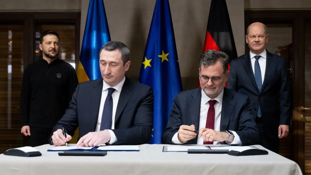 Заместитель премьер-министра Украины Алексей Чернышов и глава Федеральной канцелярии Вольфганг Шмидт подписывают взаимное соглашение о намерениях по созданию «Центров единства» на Мюнхенской конференции по безопасности, 15 февраля 2025 года. Фото: Sven Hoppe / EPA-EFE