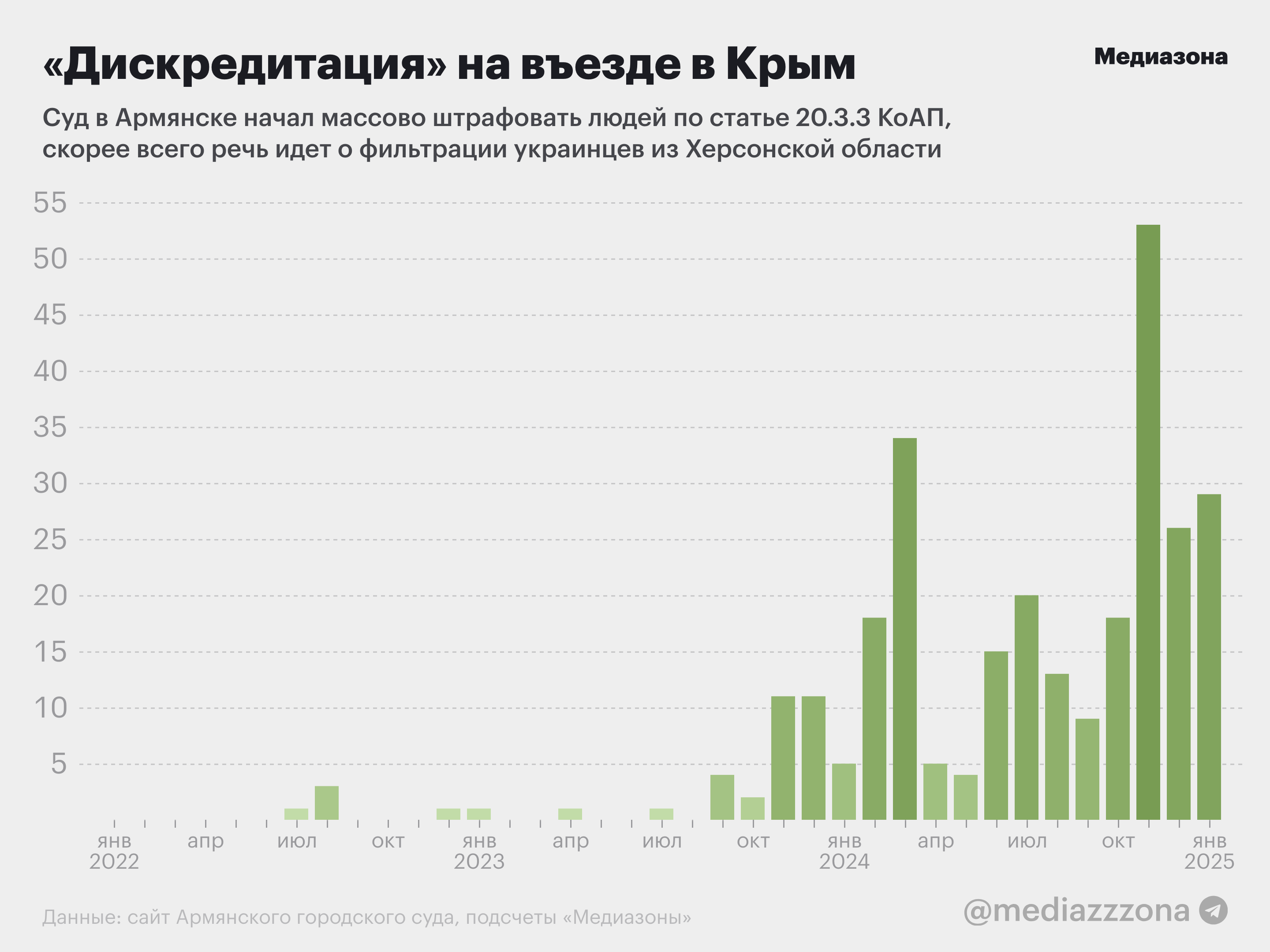 «Медиазона» изучила доступные на сайте Армянского городского суда решения по административным делам. Все они составлены за публикации в соцсетях — фейсбуке, инстаграме и телеграме — в которых рассказывалось о войне и действиях российских военных. Хотя абсолютно все фигуранты административных дел в решениях обозначены как граждане России, при выборочной проверке по слитым базам данных их можно идентифицировать как уроженцев Украины, в основном Херсонской области.