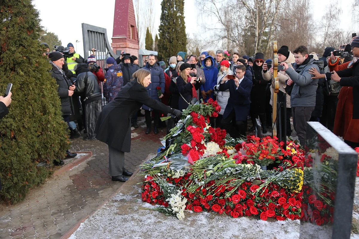 Одними из первых прибыли на своем служебном авто пунктуальные послы. Их было больше десятка — Линн Трейси (США), Джон Уильям Гиринг (Австралия), Марк Джулиан Трейнор (Новая Зеландия), Ролан Галяраг (Евросоюз), Найджел Кейси (Великобритания) и другие. Они по очереди возложили на могилу алые и белые букетики гвоздик и роз, которые выделялись среди других цветов тем, что были перевязаны ленточкой в цвета флагов их стран. Официальных речей послы не произносили. Лишь отметили, что Навальный многое значил для их государств и граждан, а сами они следили за его оппозиционной деятельностью, начиная с первых его твитов в соцсетях.