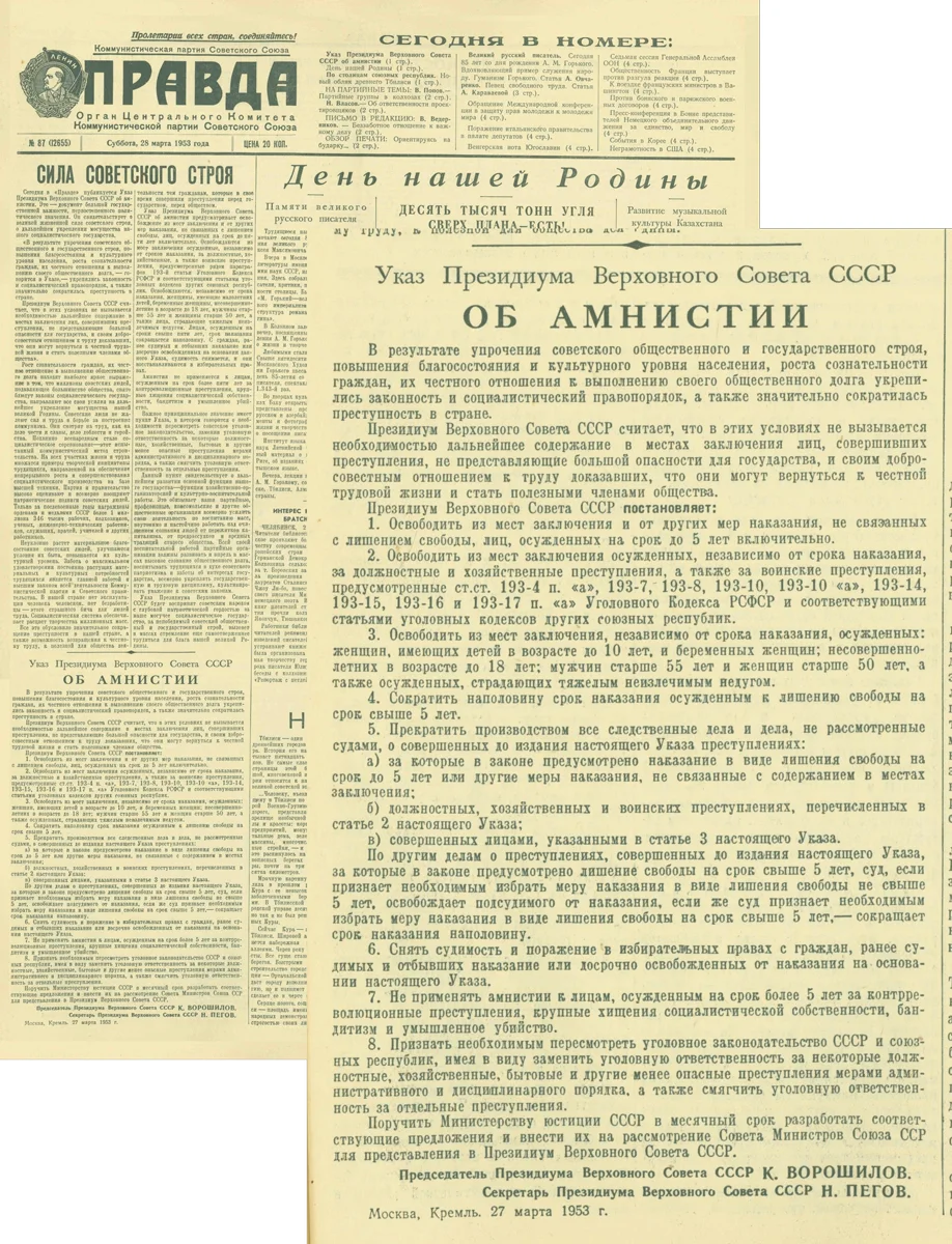 1953 год. 5 марта умирает вождь всех времен и народов. Начинается борьба за власть. Ключевую роль в этой борьбе играет Лаврентий Берия, на тот момент уже министр внутренних дел СССР и одновременно первый заместитель Председателя Совета министров СССР Георгия Маленкова. К концу марта 1953 года Берия подготовил проект указа об амнистии, который предполагал освобождение из тюрем женщин, имеющих детей возрастом до десяти лет, беременных женщин, несовершеннолетних до 18 лет, пожилых старше 60 лет и тяжело больных людей. В докладной записке на имя Маленкова Берия указывал, что из 2,5 миллионов заключенных ГУЛАГа лишь 220 тысяч человек являются особо опасными государственными преступниками (осужденные за бандитизм, умышленное убийство, за контрреволюционные преступления и за хищения социалистической собственности в особо крупных размерах). На эту категорию распространять амнистию не предлагалось. Кроме того, Берия предлагал освободить всех лиц со сроками до пяти лет включительно и вдвое сократить срок наказания осужденным на срок более пяти лет.