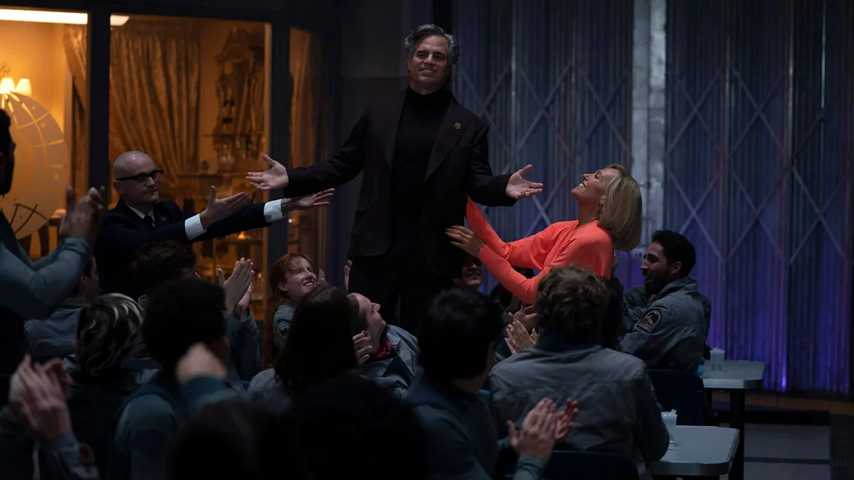 Но, возможно, Пон Чжун Хо захотелось поиграть в американский формат с приключением полусказочного героя: Микки такой же неглупый простофиля, как Иван-дурак из русских сказок — по драматургическим аркам голливудского блокбастера. С появлением двойника-клона Микки под номером 18 от героя отделяется его «темная» сущность, готовая мгновенно прибегнуть к насилию и бросить вызов Маршаллу. Паттинсон мощно и задорно справляется и с раздвоением себя, и с комедией, а в космосе он уже бывалый игрок: он отрывался от Земли и находился в экстремальных условиях у Клэр Дени в «Высшем обществе» (2018). Играющий сбрендившего царя уморительный Марк Руффало создает пародию одновременно и на Дональда Трампа, и на Илона Маска — получается ничуть не хуже, чем у Алека Болдуина в программе Saturday Night Live. Удастся ли героям устроить переворот и скинуть зигующего «трампа» в отдельно взятом фильме? Пон Чжун Хо как минимум дает им шанс.