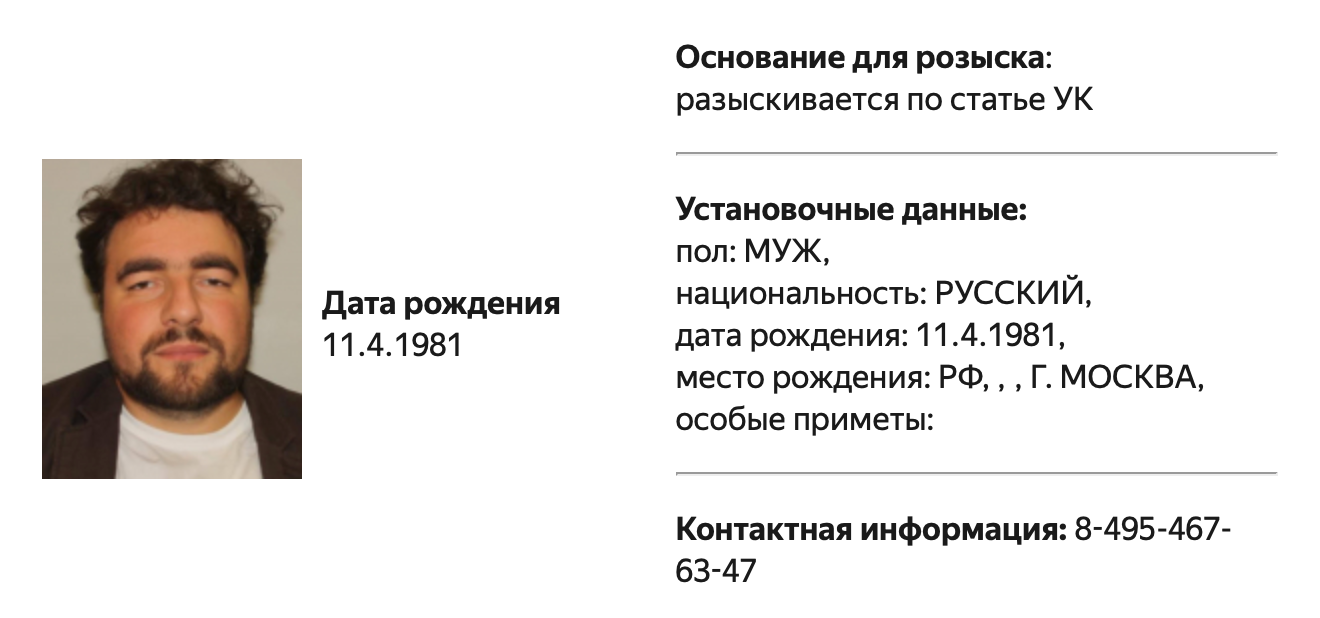 Судя по дате загрузки фотографии Преображенского в базу МВД, он был добавлен в розыск сегодня утром. В качестве контактного номера в карточке указан телефон дежурной части ОМВД по району Гольяново в Москве.