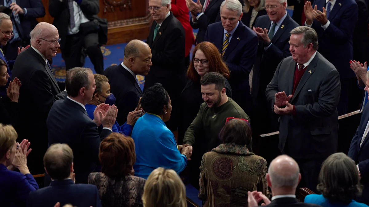 Президент Украины Владимир Зеленский приветствует членов Конгресса США перед своим выступлением в Капитолии в Вашингтоне, 21 декабря 2022 года. Фото: Офис Президента Украины