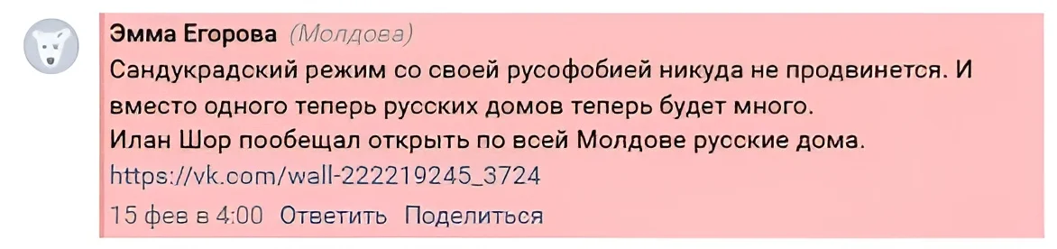 «Санду в рамках своей русофобской политики решила закрыть "Русский дом", а в итоге получит множество "Русских домов" по всей Молдове», — пишет один из ботов.