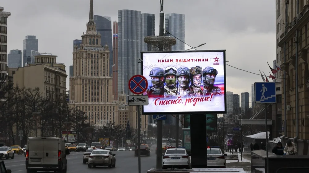 A military-themed billboard in Moscow. Photo: EPA-EFE/YURI KOCHETKOV