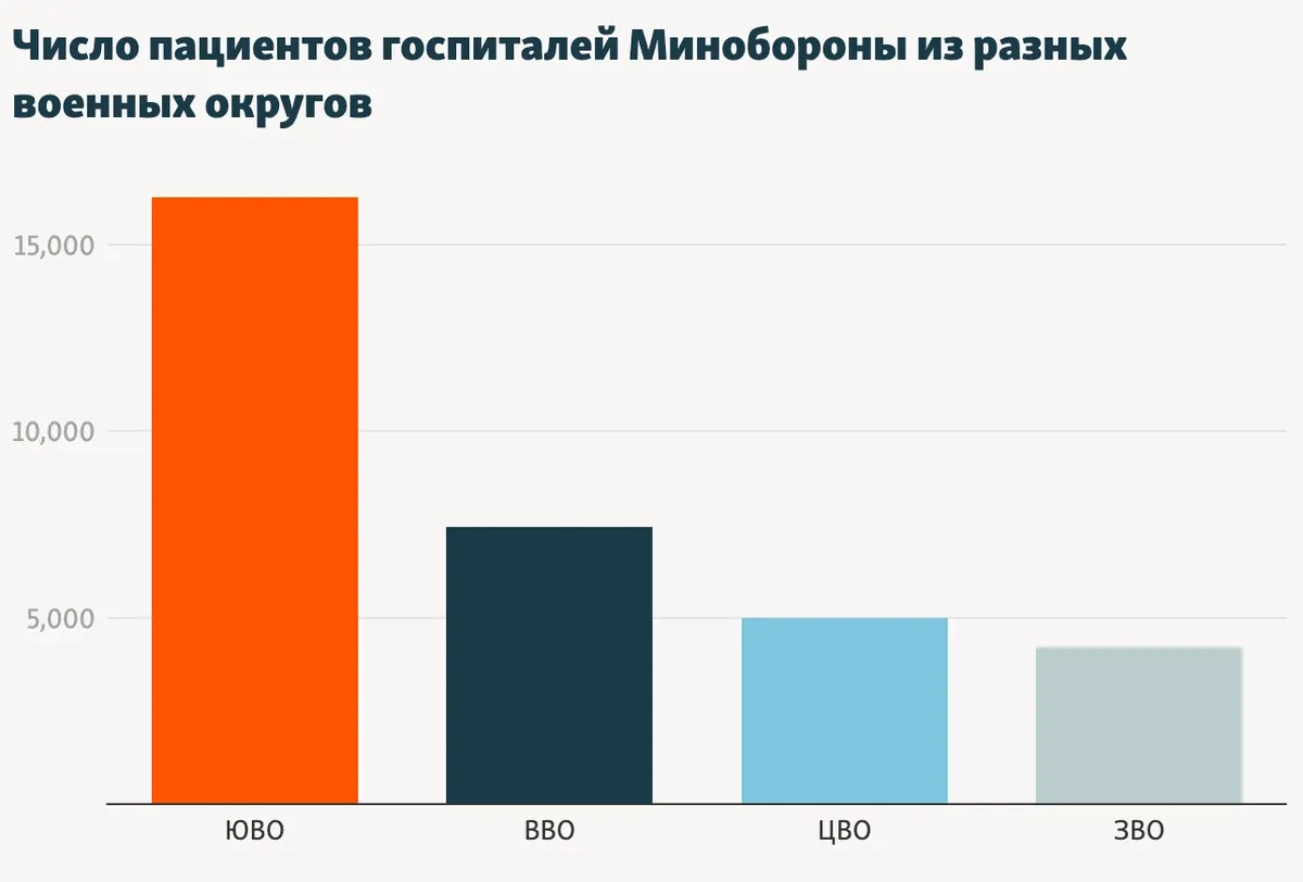 По общему числу госпитализированных военных лидирует Южный военный округ (ЮВО) — их около 50% от общего числа людей, у которых в базе была указана отметка о принадлежности к военному округу. Военный аналитик Кирилл Михайлов отметил, что к ЮВО относятся в том числе военнослужащие с оккупированных регионов.