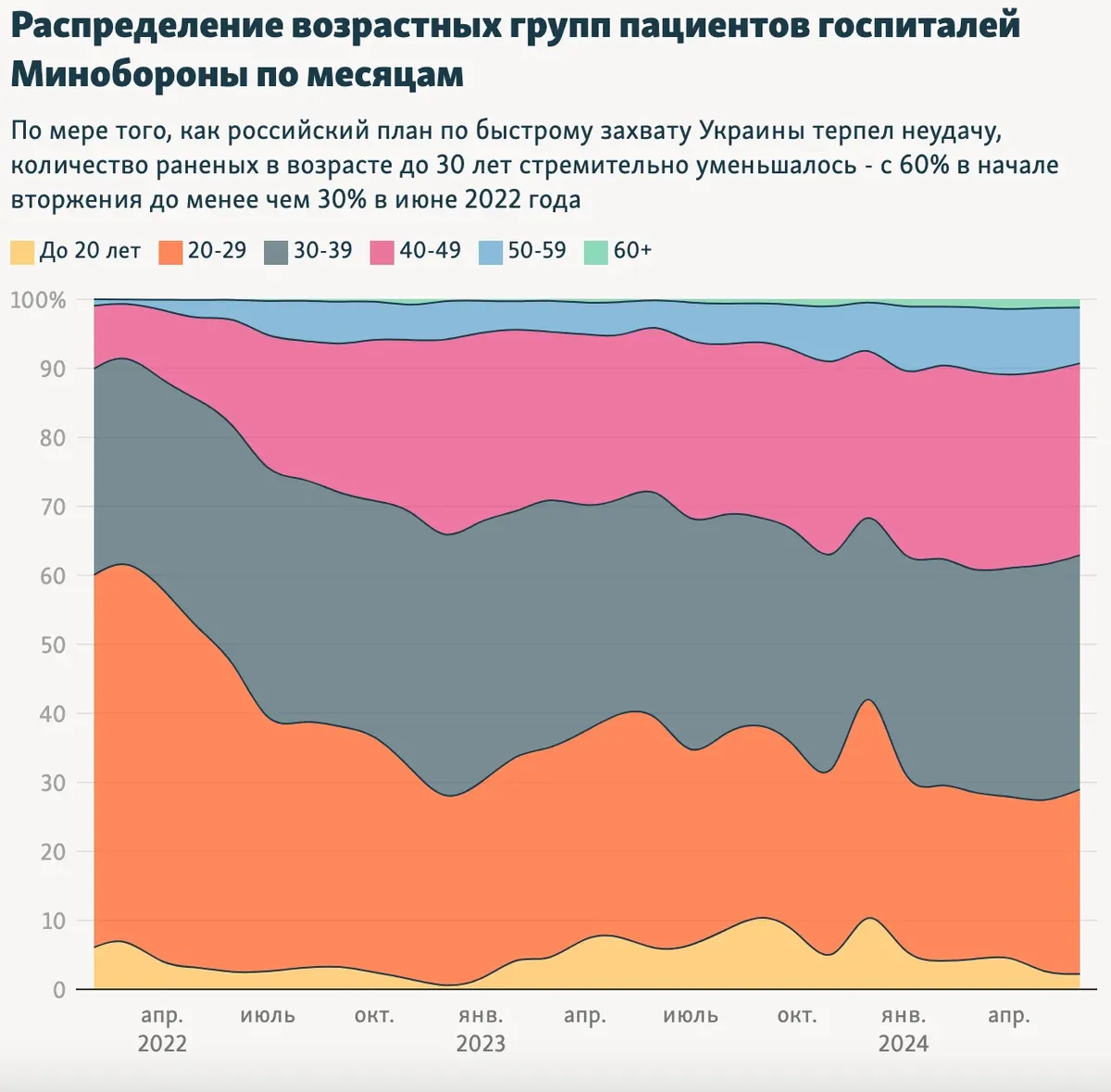 Кроме этого, со временем вырос средний возраст госпитализированных. Если в марте 2022 года доля раненых военных в возрасте от 50 лет и больше составляла 1,3% от всего числа госпитализированных, то в апреле 2024 года их количество превысило 11%. Журналисты отмечают, что резкий скачок случился в конце 2023 — начале 2024 года.