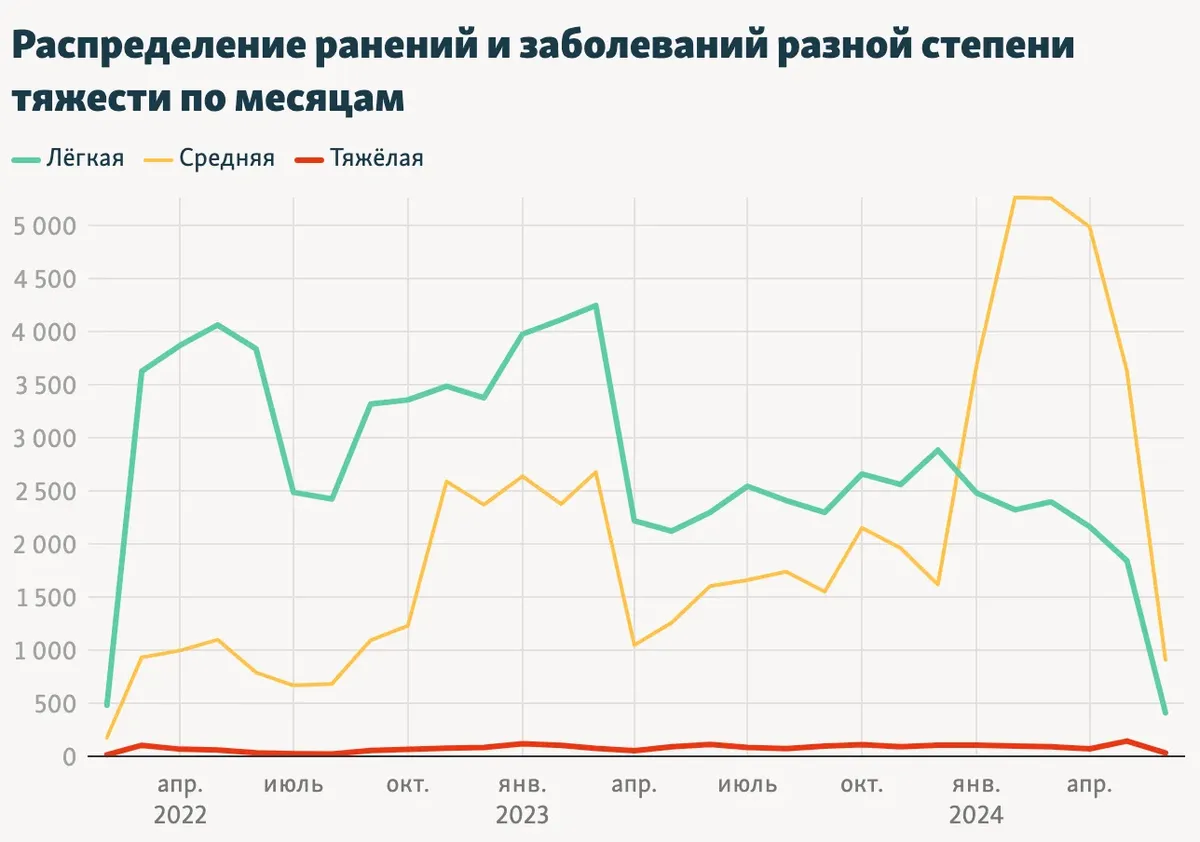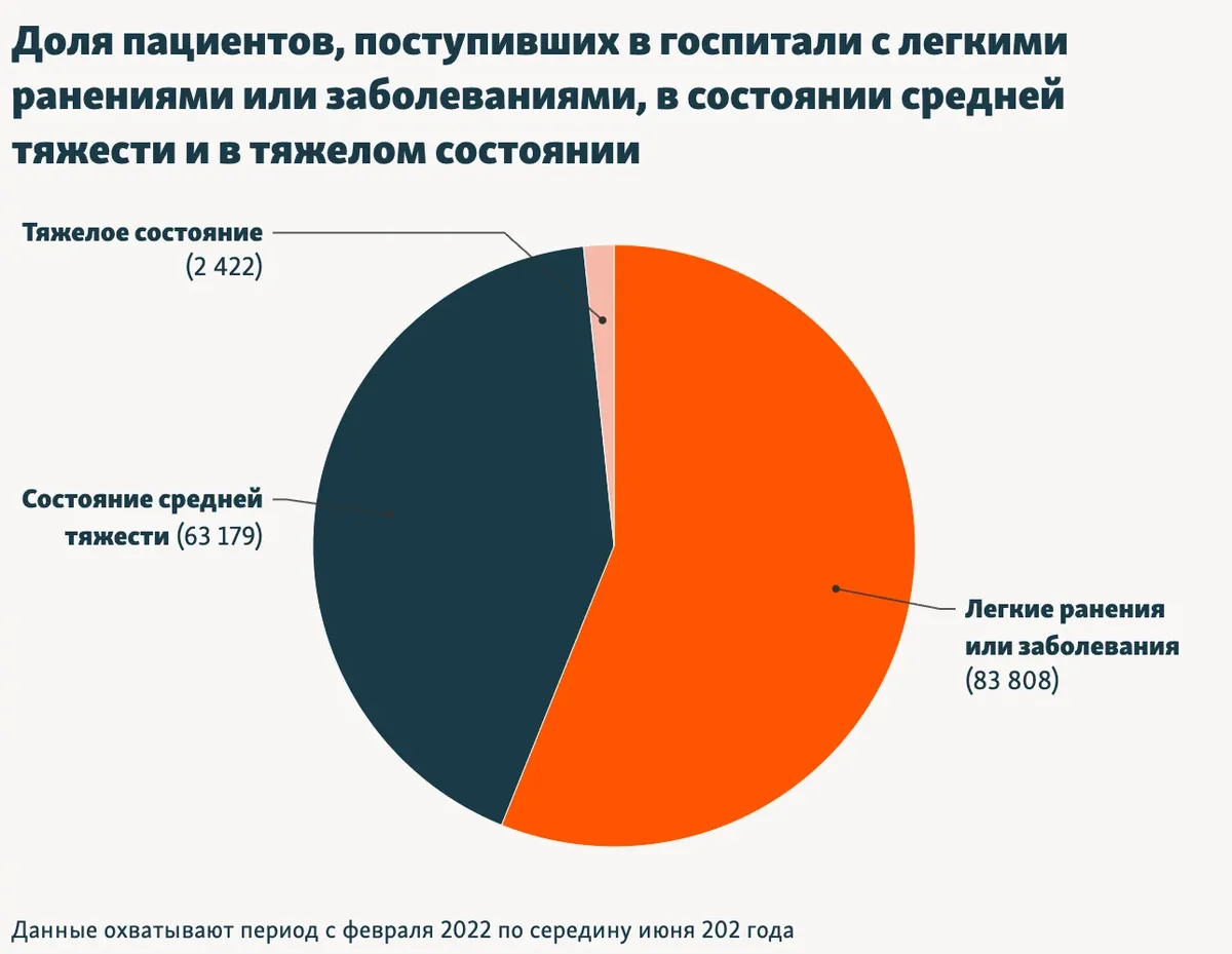 Помимо этого, из базы данных Минобороны РФ следует, что с января 2022 года по июнь 2024 года тяжелые ранения получили 3205 военных, средние — 37 567 военных, легкие — 63 821 военный. По словам Жиляева, тяжесть ранений в госпиталях могут умышленно занижать, чтобы быстрее вернуть солдат на фронт. Он отметил, что единственный вид травм, после которого военных не отправляют снова на передовую — это ампутация конечностей. В документе содержатся данные о более 3200 таких случаев.