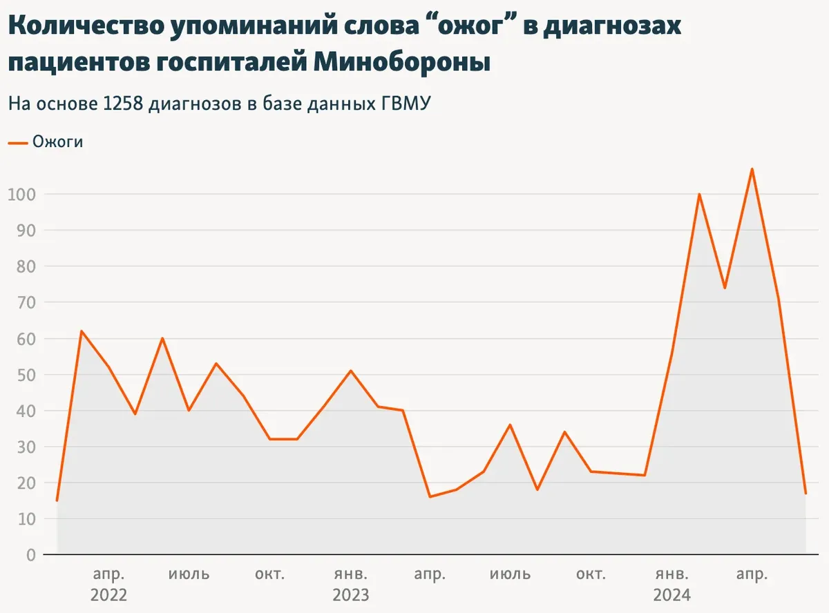 «Радио Свобода» также обратила внимание, что с ноября 2022 года до марта 2023 года и в аналогичный период с 2023 по 2024 год росло число обморожений, ожогов и психических расстройств у солдат.