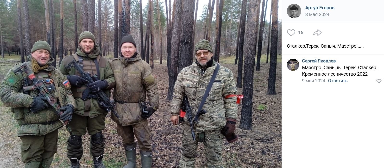 Ампутации – хороший пример искажения тяжести ранений в базе. Многие случаи ампутаций конечностей имеют в графе "тяжесть" отметку "легкая" – вопреки перечню легких увечий, травм и контузий в законе. Например, "легко раненым" в базе записан 60-летний младший сержант Артур Егоров, который воевал в составе 54-го мотострелкового полка 3-го армейскго корпуса – оперативно-тактического объединения сухопутных войск РФ, созданного в 2022 году из региональных добровольческих батальонов в посёлке Мулино Нижегородской области. В мае 2022 года Егоров, как следует из его публикации во "ВКонтакте", воевал в районе Кременной в Луганской области и имел позывной "Маэстро" (на фото ниже – крайний справа).
