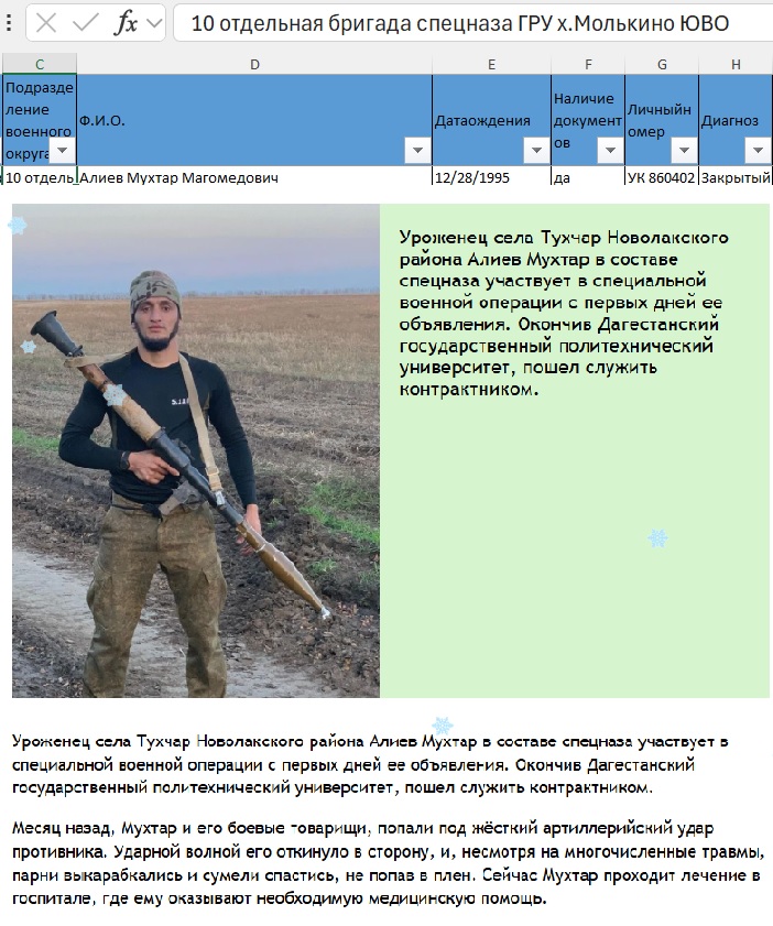 В базе упоминаются и военные, о которых писали СМИ: например, уроженец Новолакского района Дагестана Мухтар Алиев, который, как сообщало в декабре 2022 года издание "Голос времени", попал под обстрел и сумел спастись. База ГВМУ позволяет узнать, что он был ранен месяцем ранее, в середине ноября, и был госпитализирован с диагнозом "Закрытый перелом костей носа" в 419-й военный госпиталь в Краснодаре. Из базы данных следует, что Алиев, как и еще более ста человек, информация о которых есть в документе, служил в военной разведке, в 10-й отдельной бригаде спецназа ГРУ, дислоцированной на хуторе Молькино Краснодарского края.