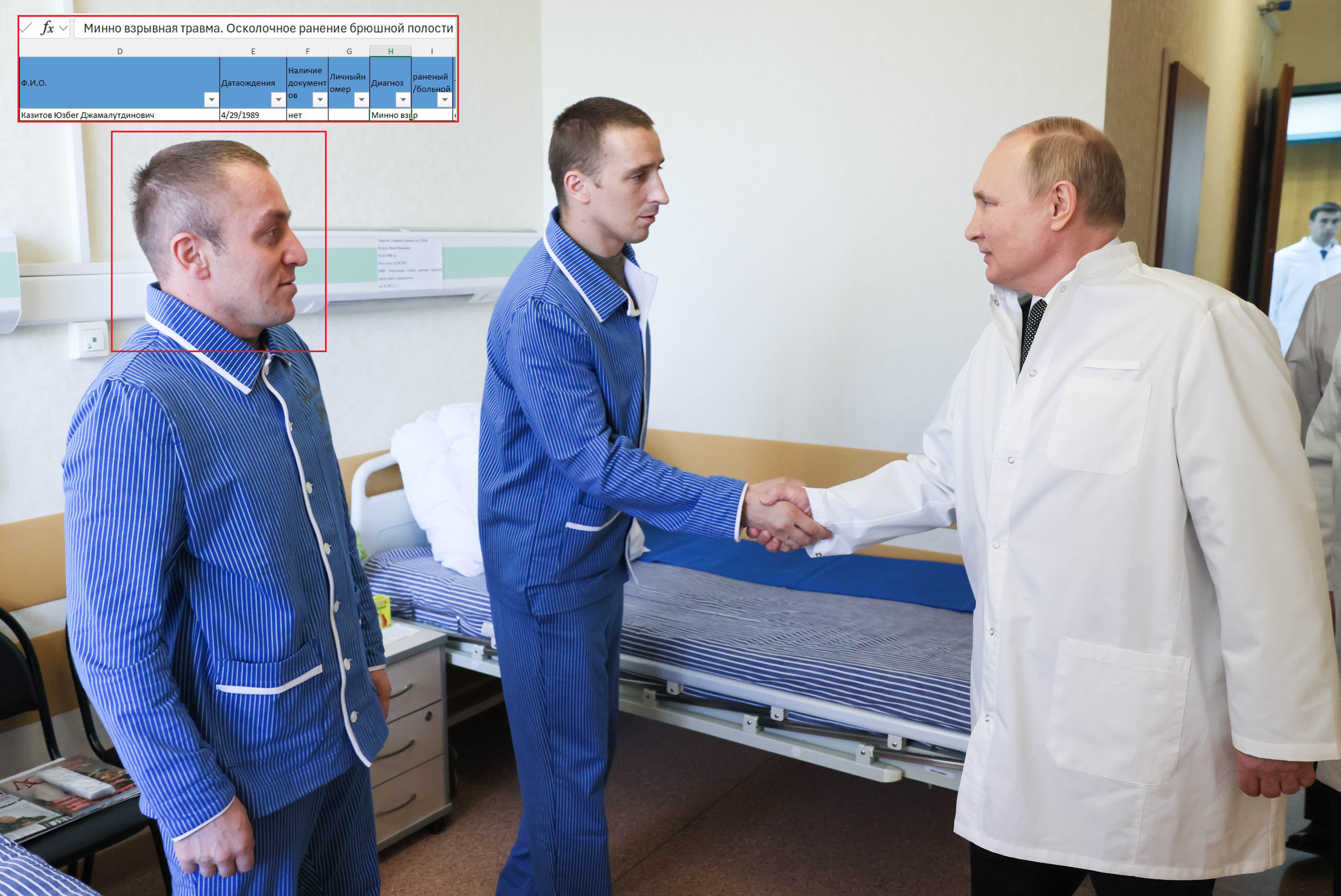 Есть в базе и раненые, которых лично посещал в госпиталях Владимир Путин. На фотографии ниже, опубликованной агентством ТАСС 25 мая 2022 года, Путин, как утверждается, запечатлен с ранеными Юзбегом Казитовым и Иваном Петруком в Центральном военном клиническом госпитале имени Мандрыка в Москве. Из базы данных следует, что Казитов действительно был ранен 24 марта и доставлен с диагнозом "Минно-взрывная травма, осколочное ранение брюшной полости" сначала в Донецкую республиканскую больницу, затем, 28 марта, в 1602-й военный клинический госпиталь в Ростове-на-Дону, а 7 апреля был переведен в Центральный военный клинический госпиталь. Второй военный на фото, жмущий руку президенту Иван Петрук, отсутствует в базе ГВМУ. Как ранее удалось выяснить с помощью сервисов по распознаванию лиц, как минимум один из "военных", попавших на другое фото этого же посещения госпиталя Путиным и тогдашним министром обороны Сергем Шойгу, оказался сотрудником Федеральной службы охраны. Возможно, Петрук действительно был ранен и не попал в базу ГВМУ по какой-то другой причине.