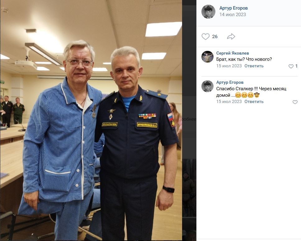 В декабре 2022 года он поступил в 1602-й военный клинический госпиталь в Ростове-на-Дону с диагнозом "минно-взрывная травма, травматическая ампутация правой нижней конечности". В июле 2023 года Артур Егоров опубликовал фотографию из госпиталя, на которой видно, что он действительно лишился ноги. На снимке, который сделан в Военно-медицинской академии им. Кирова в Санкт-Петербурге, он позирует с начальником Главного управления кадров Министерства обороны Российской Федерации Игорем Муравлянниковым. Муравлянников приезжал туда вручать раненым награды и удостоверения "ветерана боевых действий".