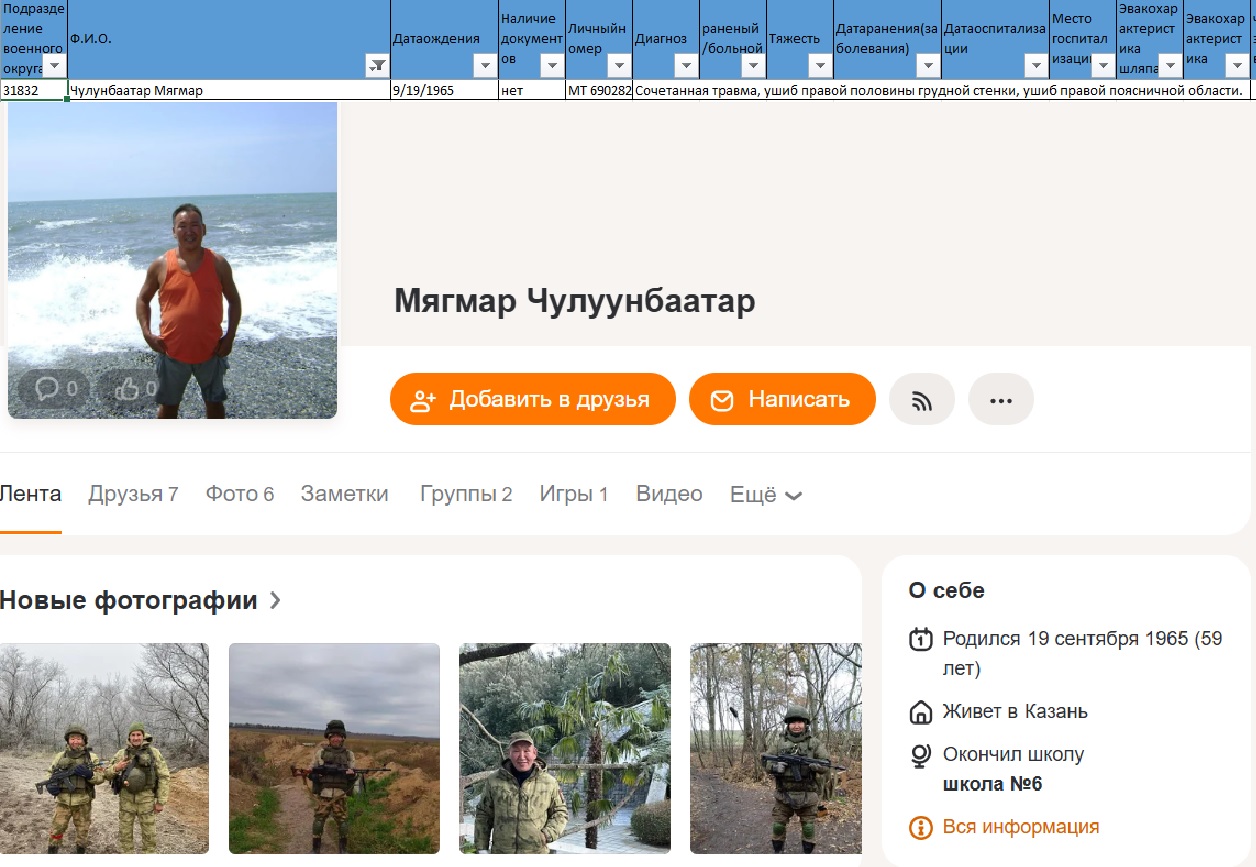 Радио Свобода проверило базу данных ГВМУ с помощью случайной выборки, дополнительные подтверждения ее подлинности мы находили и позже, в процессе подготовки материала. Благодаря датам рождения и другой информации мы нашли в ней десятки людей, которые оставили в социальных сетях следы своего участия в войне и при этом ранее не упоминались в СМИ. Например, житель Казани Мягмар Чулуунбаатар был госпитализирован в 428-й военный госпиталь в Саратове с диагнозом "Сочетанная травма, ушиб правой половины грудной стенки, ушиб правой поясничной области". Фотографии с войны он регулярно публиковал в своем аккаунте в "Одноклассниках".