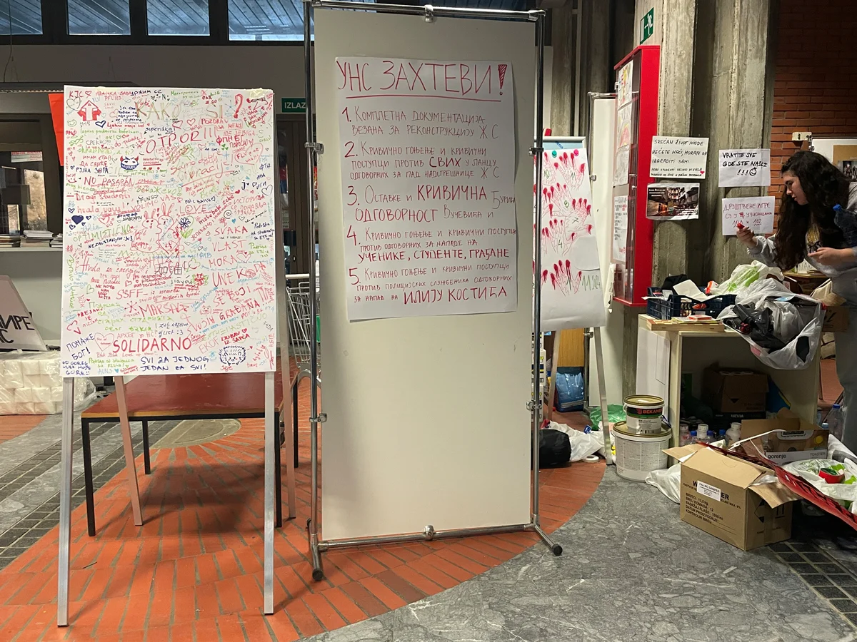 В списке пять пунктов: «публикация всех документов, связанных с реконструкцией здания вокзала в Нови-Саде», «уголовное преследование физических и юридических лиц, ответственных за падение навеса», «отставка и уголовное преследование премьера Вучевича и мэра Нови-Сада Милана Дюрича», «уголовное преследование всех ответственных за нападения на учеников, студентов и граждан в ходе мирных демонстраций», «уголовное преследование полицейских, ответственных за нападение на Илью Костича» (74-летнего участника протестов оперировали после избиения в полицейском участке. — Прим. авт.).
