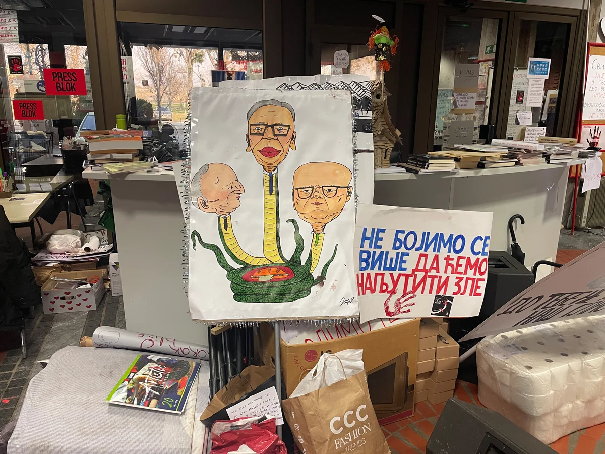Около входа красуется транспарант с изображением змея с тремя головами — президента Вучича, премьера Милоша Вучевича и, как с сомнением замечает Саво, — Милошевича. На свернувшейся в кольца змее лежит сэндвич. «Это премия тем, кто голосует и ходит на митинги правящей партии — им дают сэндвич и 2000 динар (около 20 евро) за участие», — поясняет Саво.