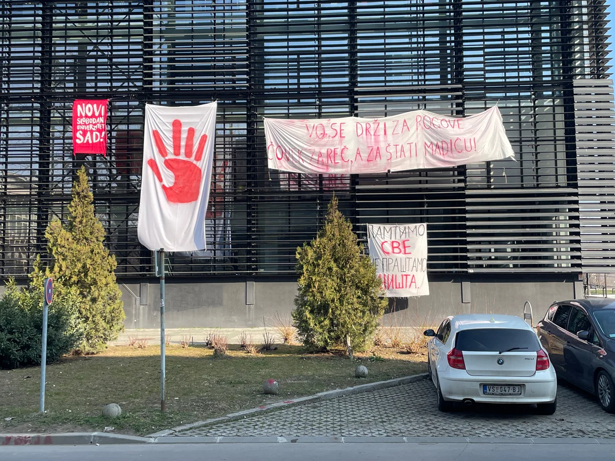 Первыми объявили о блокаде факультеты философии, филологии, политических наук, естественных наук и математики Белградского университета и факультет философии университета в Нови-Саде. Сейчас во втором городе Сербии захвачены все факультеты университета, расположенного чуть за пределами центра на берегу Дуная. Захвачено и здание ректората, на котором висит плакат: «Помним — всё, не забудем — ничего». Между факультетами припарковано несколько десятков тракторов — фермеры привезли их в город и помогают перекрывать улицы во время больших акций. На одном из тракторов написано: «Не трогай меня — я позову детей».